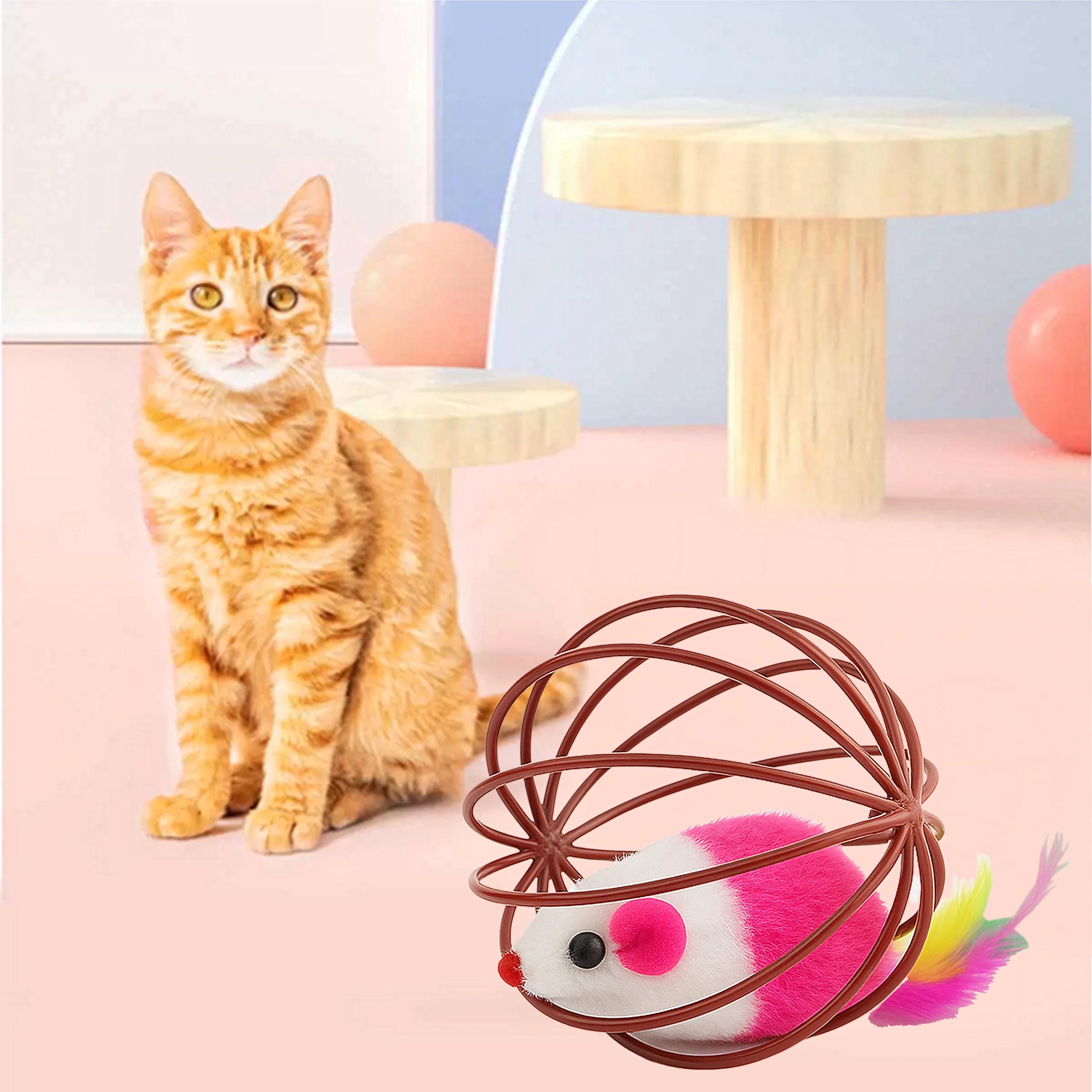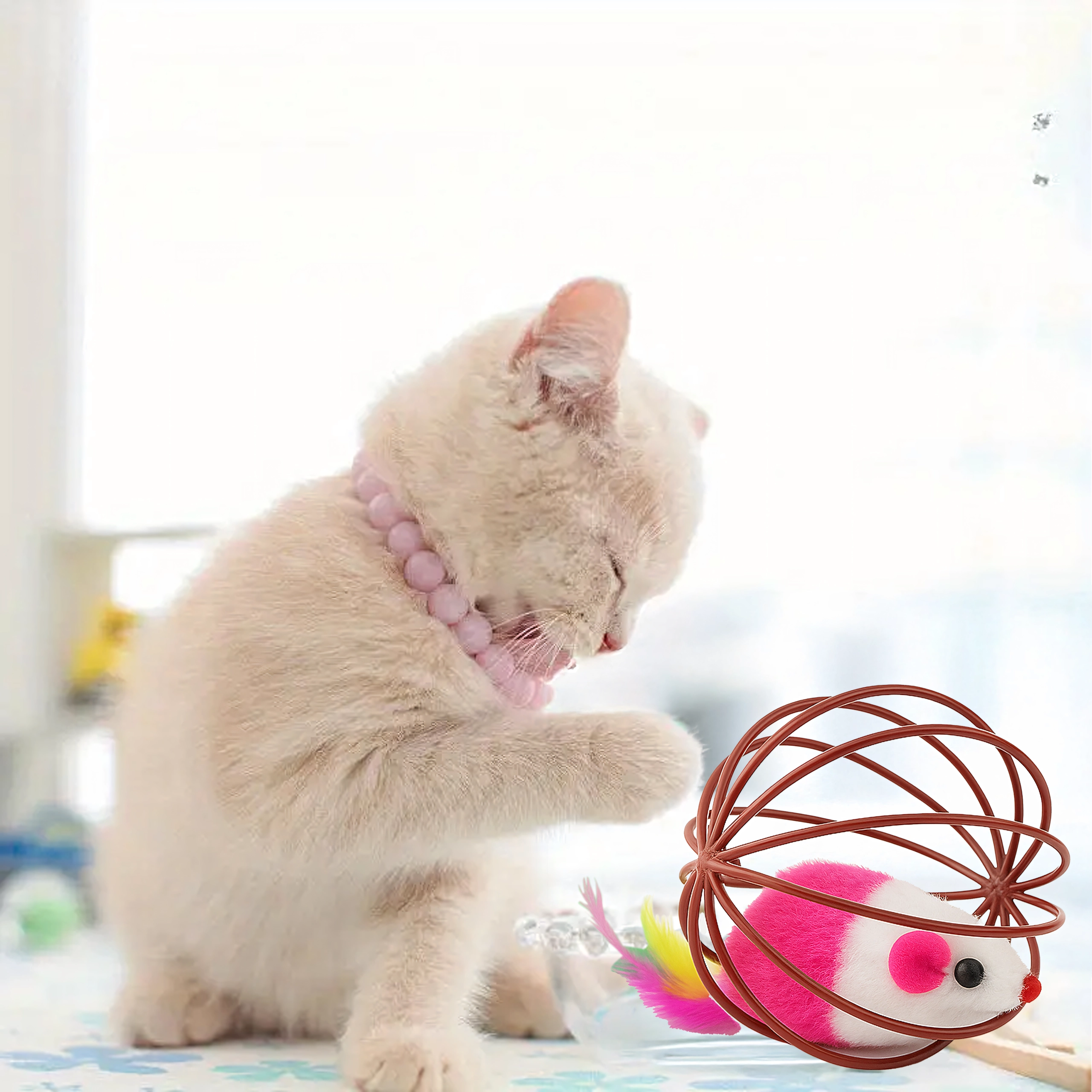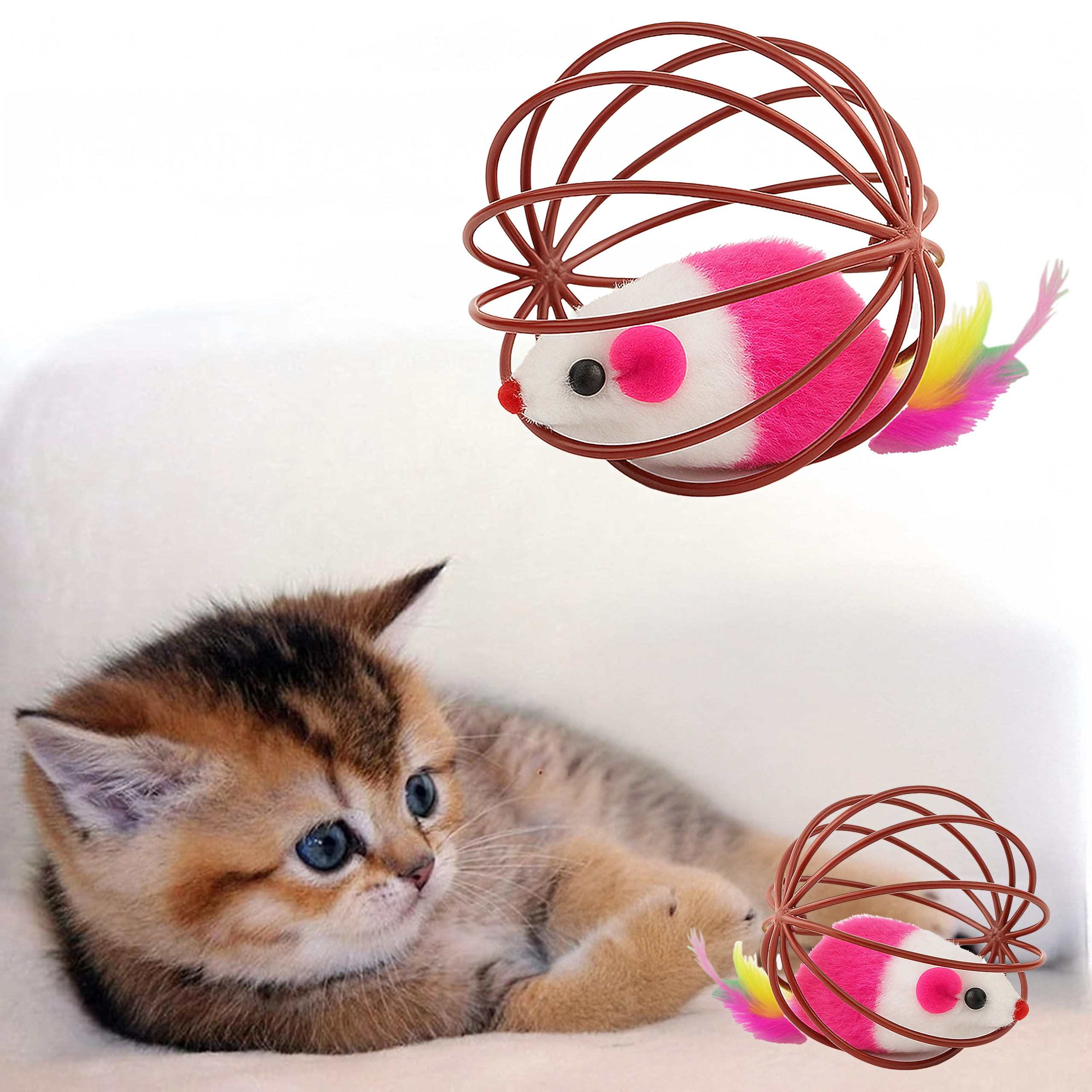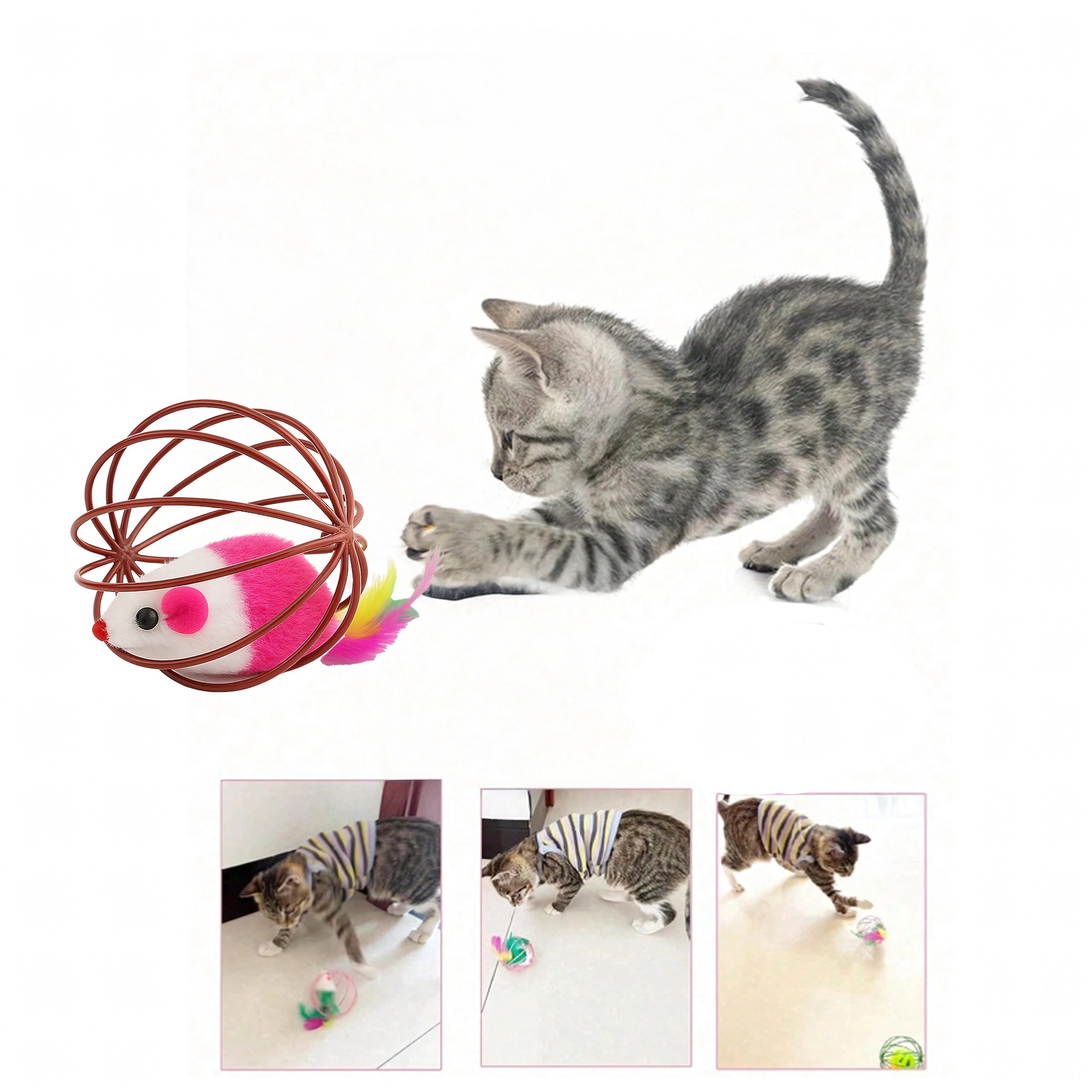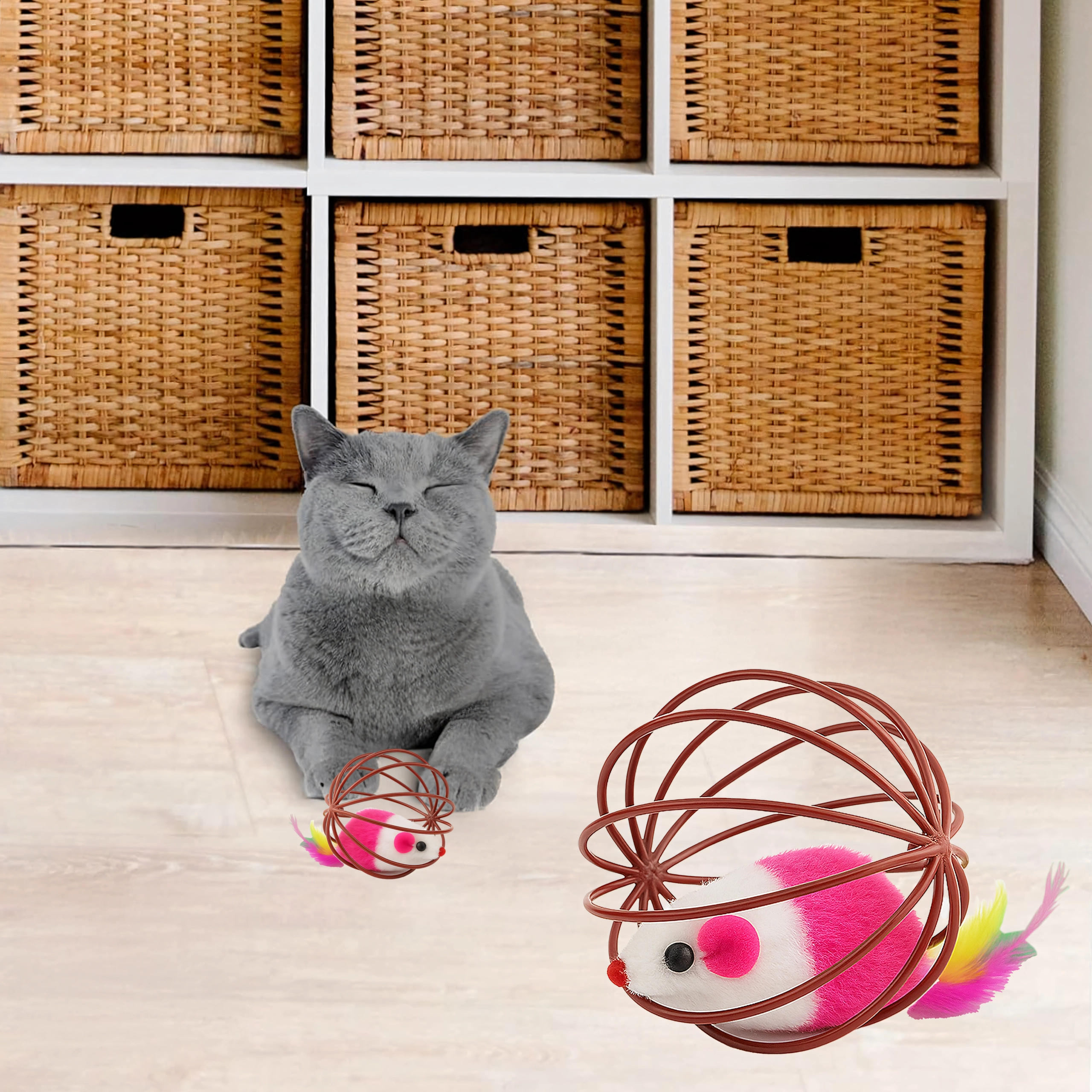 Gracias a su resistente estructura de alambre, el juguete rueda con facilidad, pero el ratón permanece seguro en el interior. La estructura abierta permite al gato agarrar y empujar bien el juguete, mientras que el suave peluche y las plumas ofrecen texturas atractivas. Una gran opción para el juego autónomo o interactivo con su dueño.