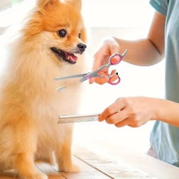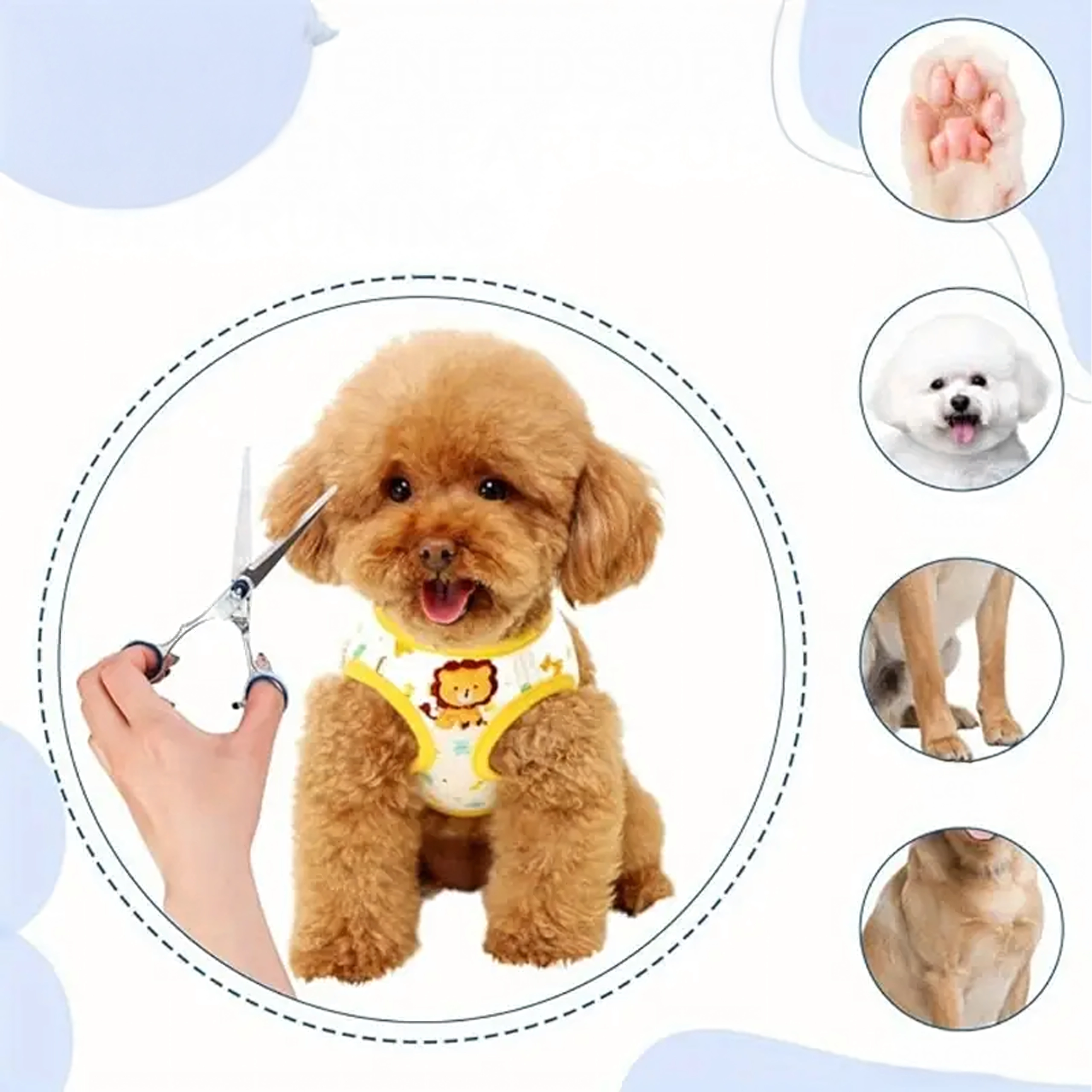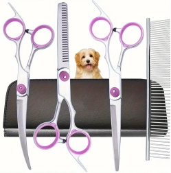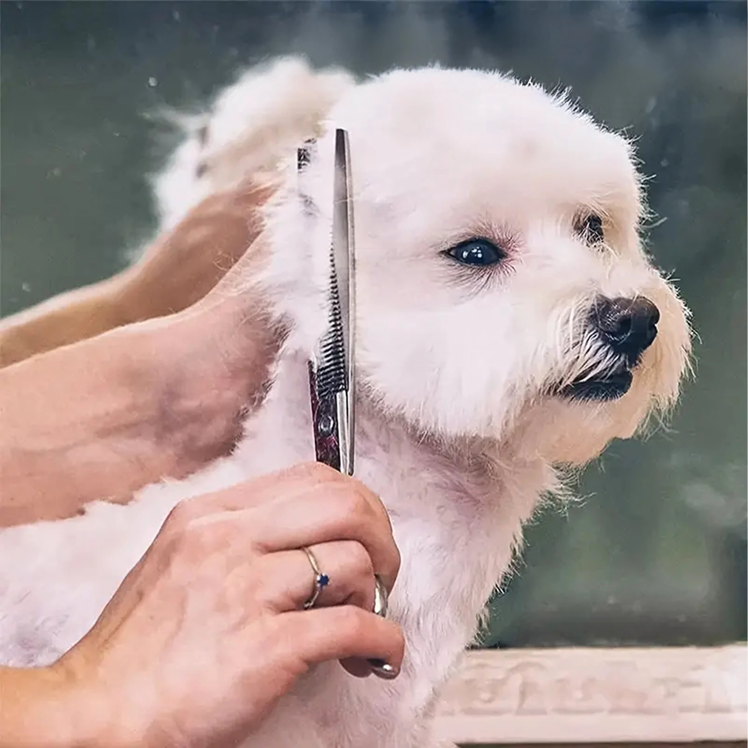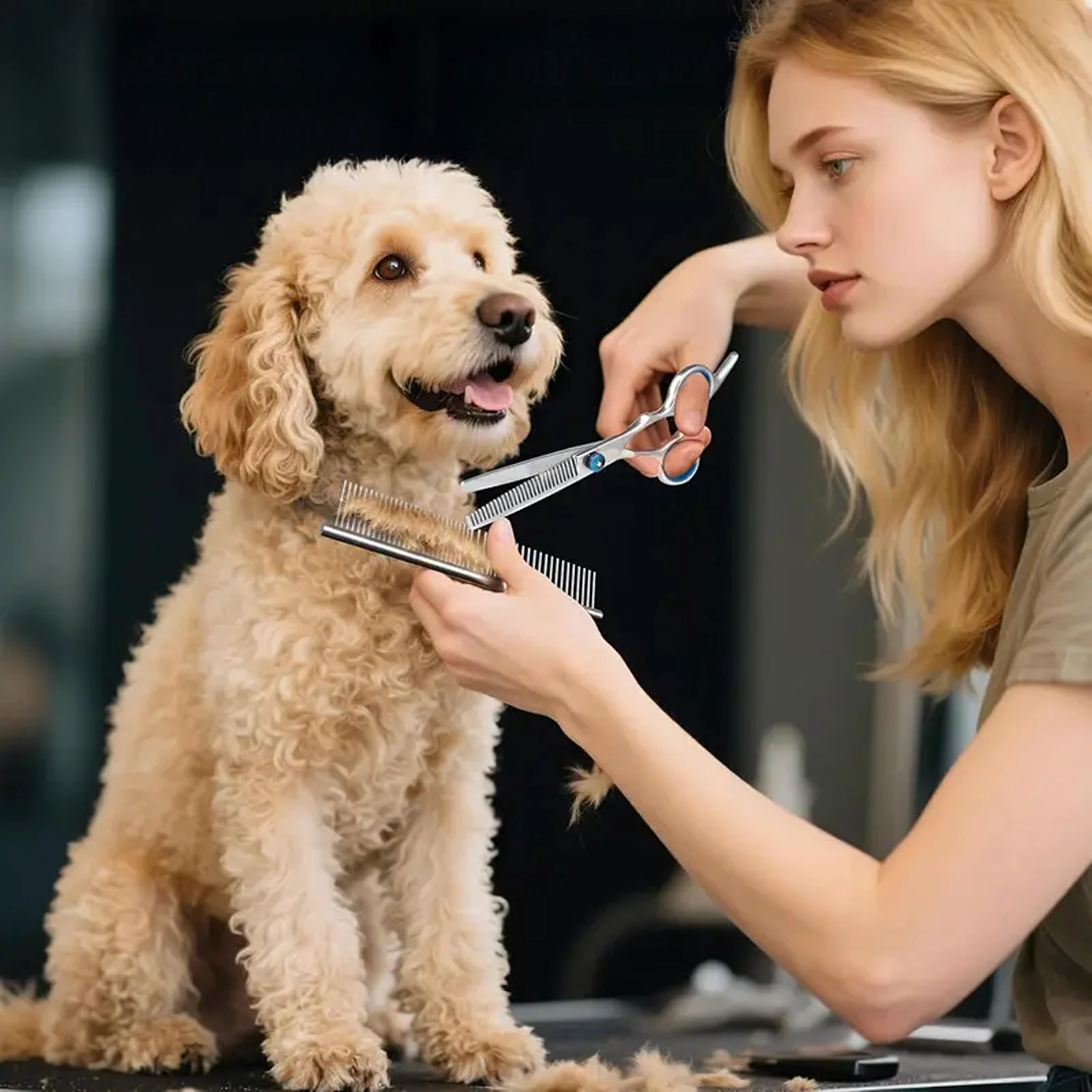 En el set encontrarás todo lo necesario para un cuidado completo del pelaje: tijeras rectas para líneas precisas, tijeras curvadas para un moldeado seguro alrededor de patas, orejas y cara, tijeras de entresacado para suavizar transiciones y un suave peine metálico para desenredar y el acabado.