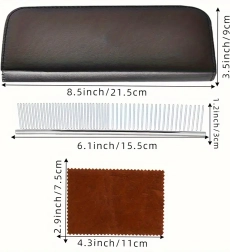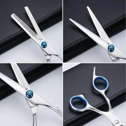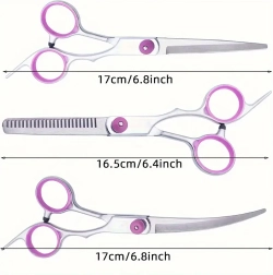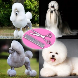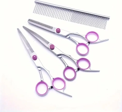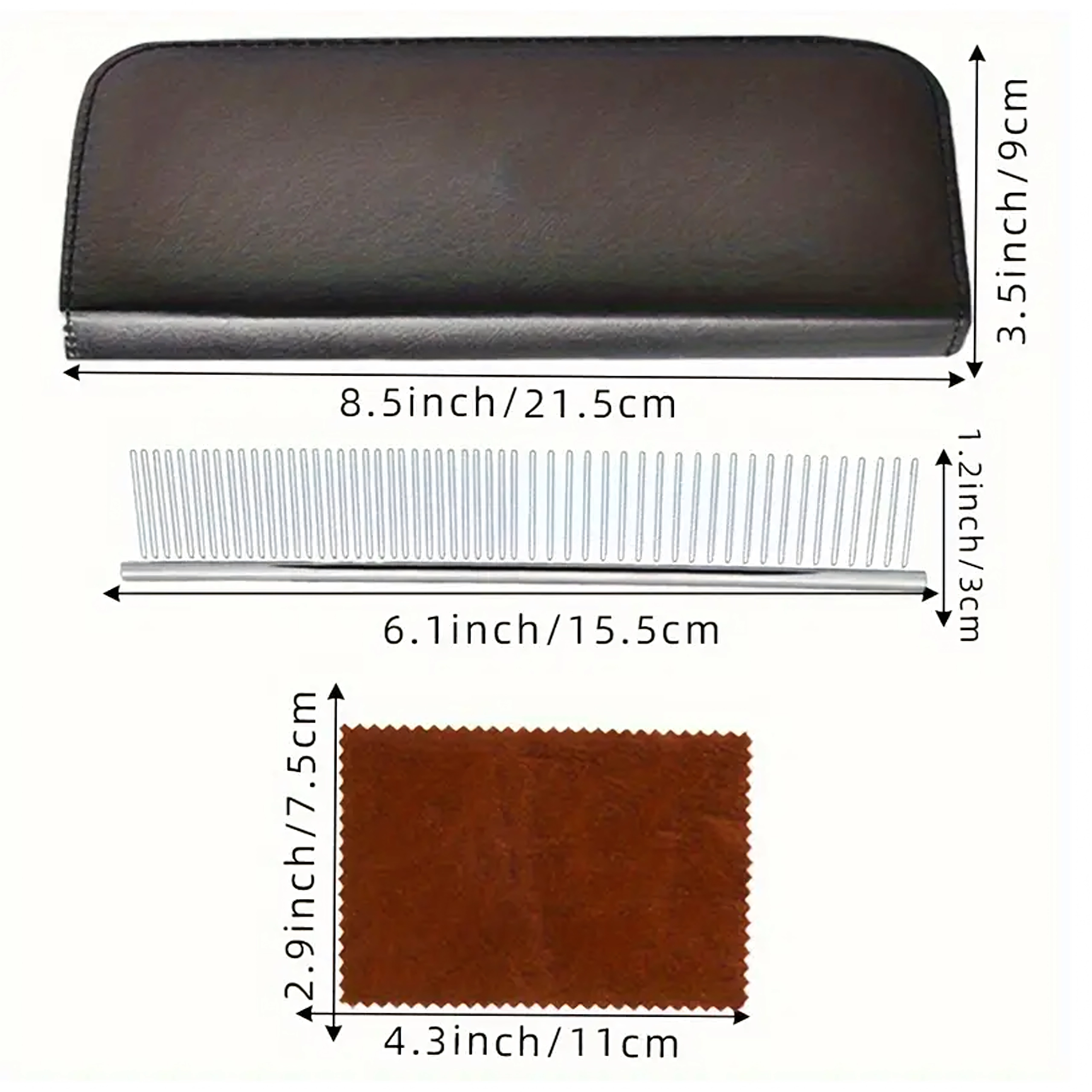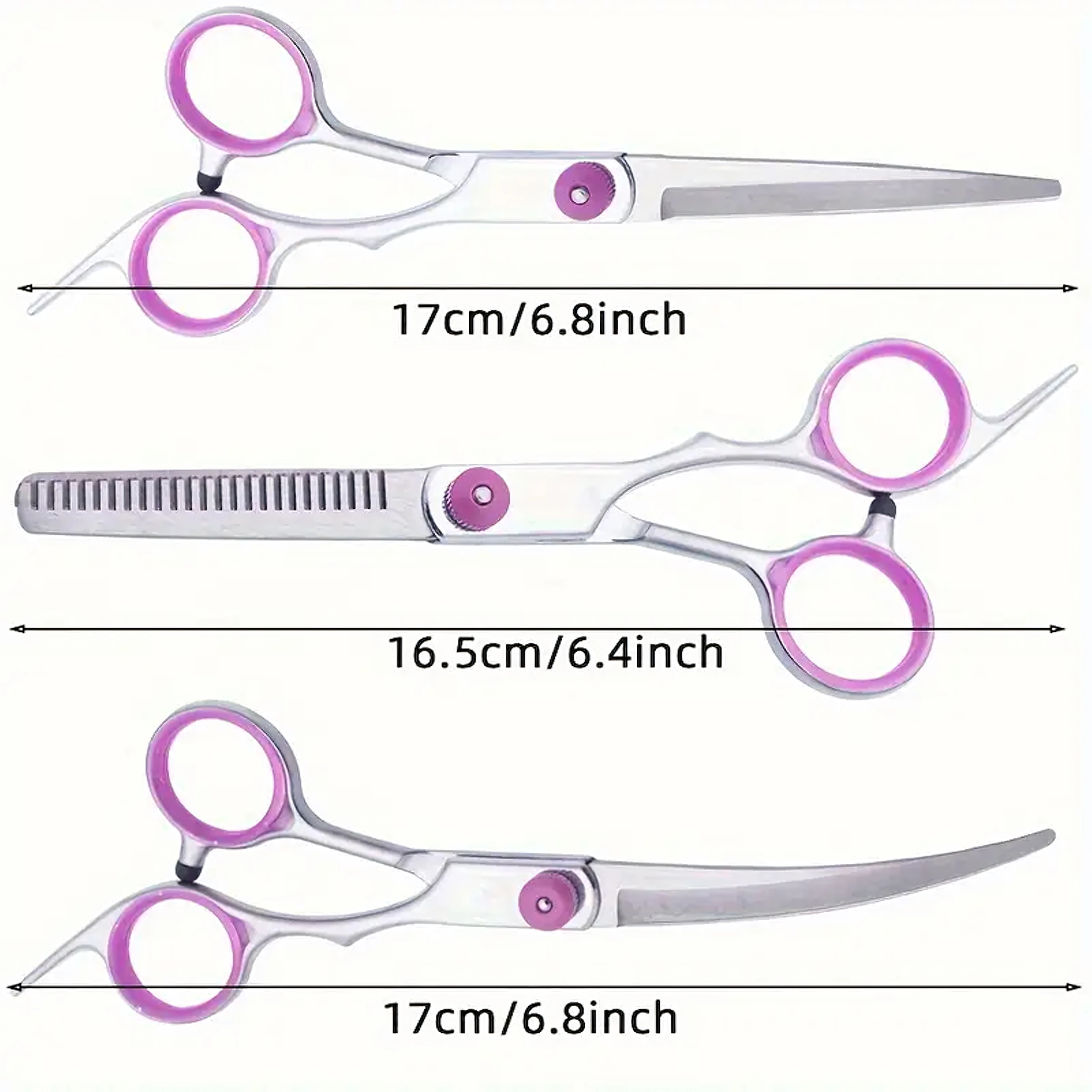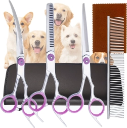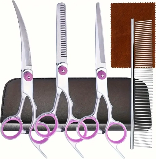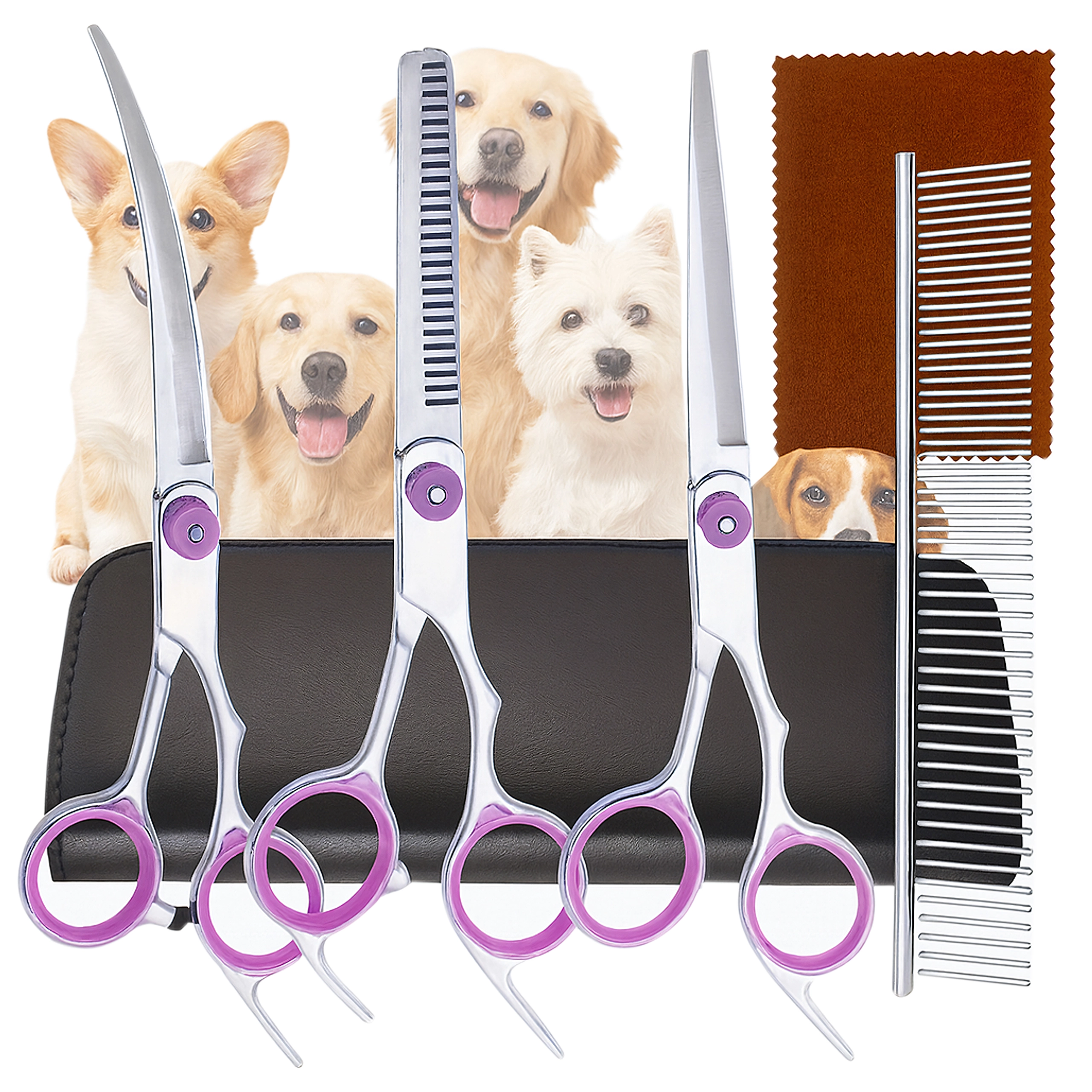 Tres tipos de tijeras (rectas, curvadas, de entresacado) + peine metálico en estuche protector. Todo para cortar, dar forma y desbastar el pelaje en un solo lugar.