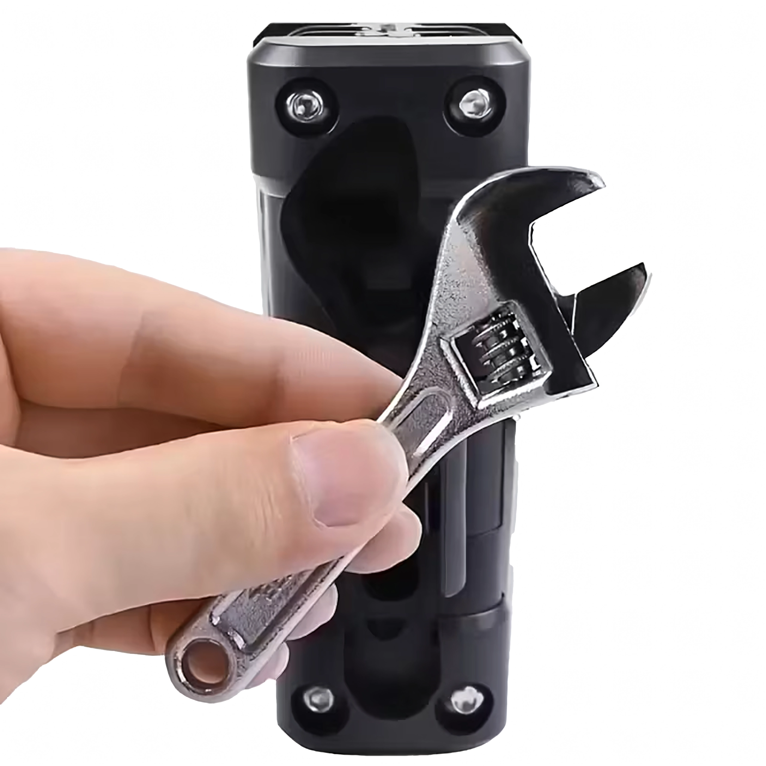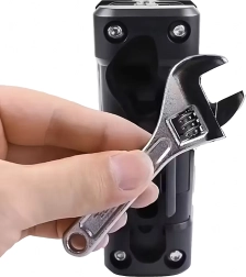 La llave ajustable integrada ayuda con diferentes tamaños de tuercas y tornillos sin necesidad de más herramientas.
