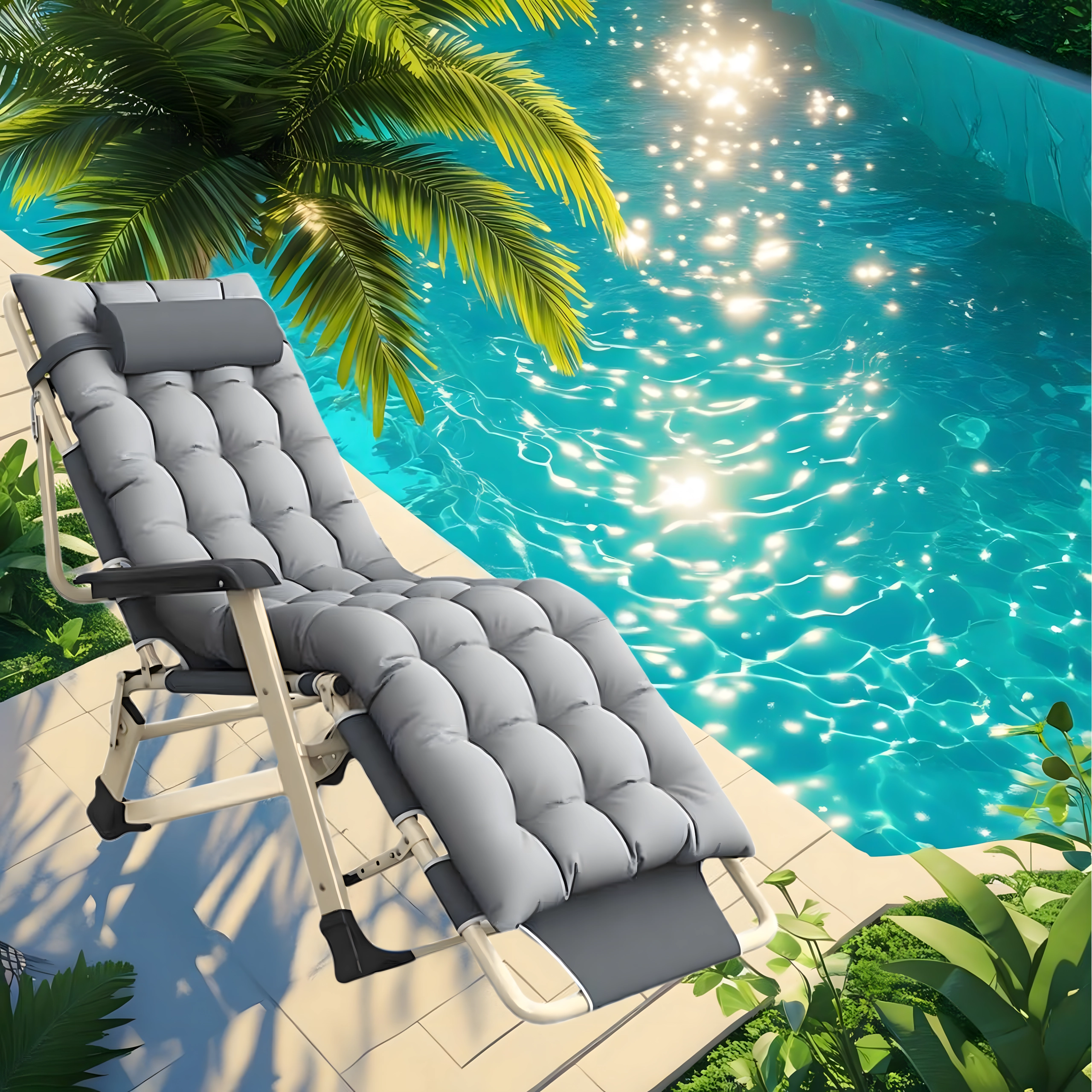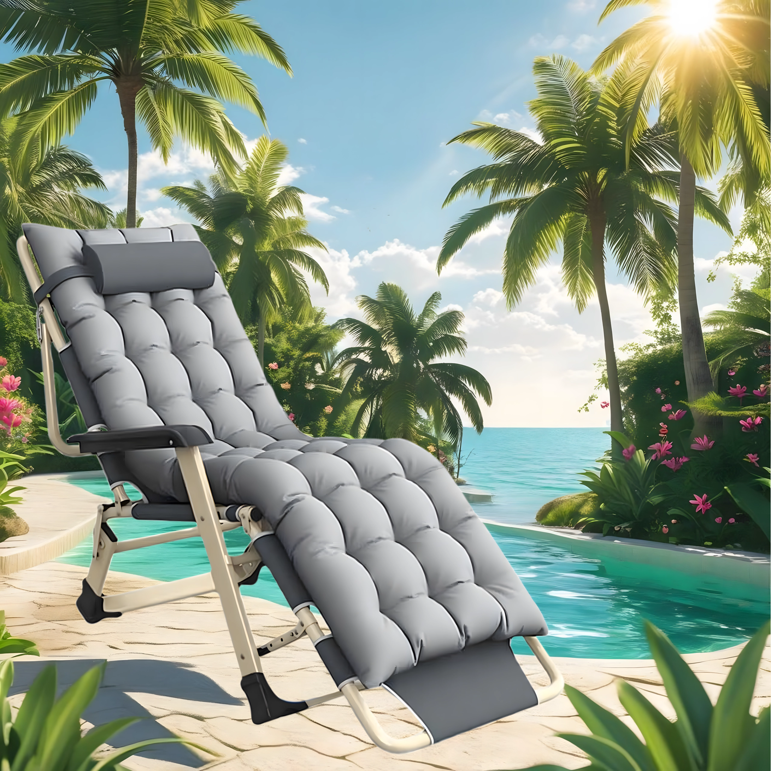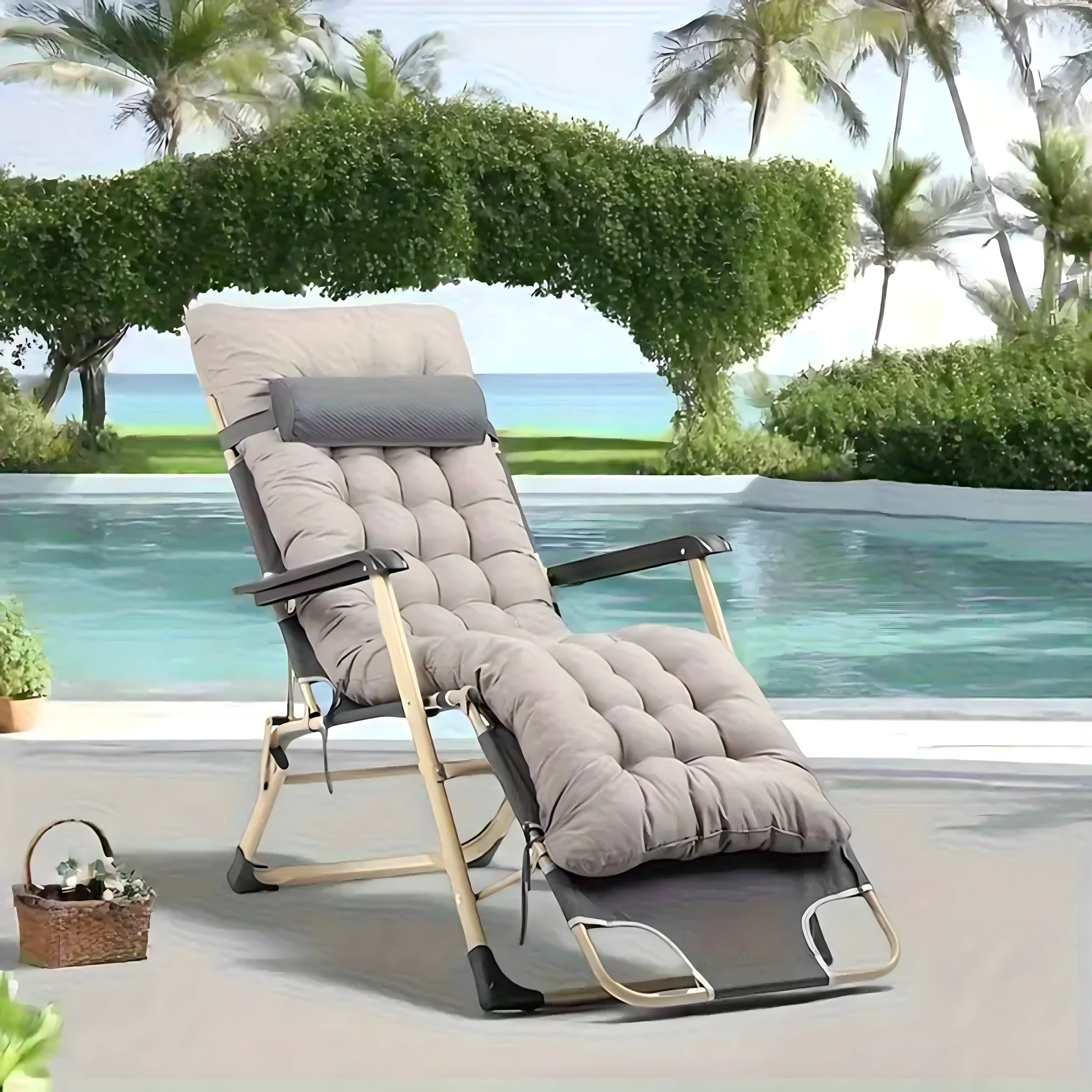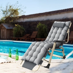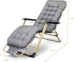 El asiento suave y acolchado con cojín para la cabeza, junto con la resistente estructura metálica con reposabrazos, garantizan comodidad y estabilidad para su uso en exteriores.