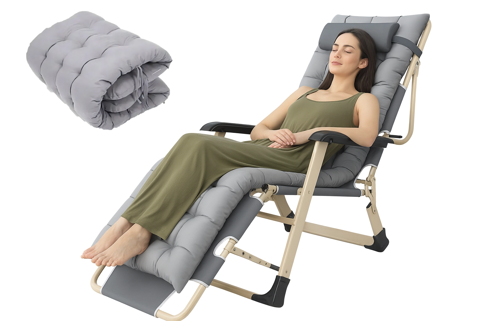 El respaldo y el reposapiés ajustables te permiten encontrar la posición ideal para relajarte, leer o dormir. El cojín desmontable alivia la zona cervical y aumenta el confort.