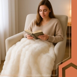 La fibra de poliéster de alta calidad garantiza estabilidad de la forma y fácil mantenimiento: basta con lavar la manta en un programa delicado a 30 °C. El material es resistente a las arrugas y al peeling, por lo que mantiene un aspecto limpio y cuidado durante mucho tiempo. Se entrega atada con una cinta de raso, por lo que también es una excelente idea para regalo.