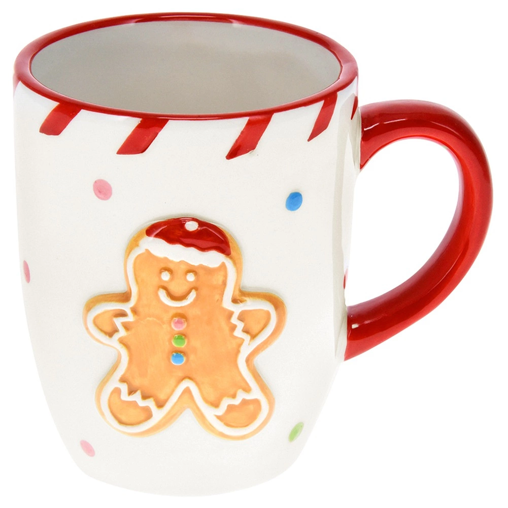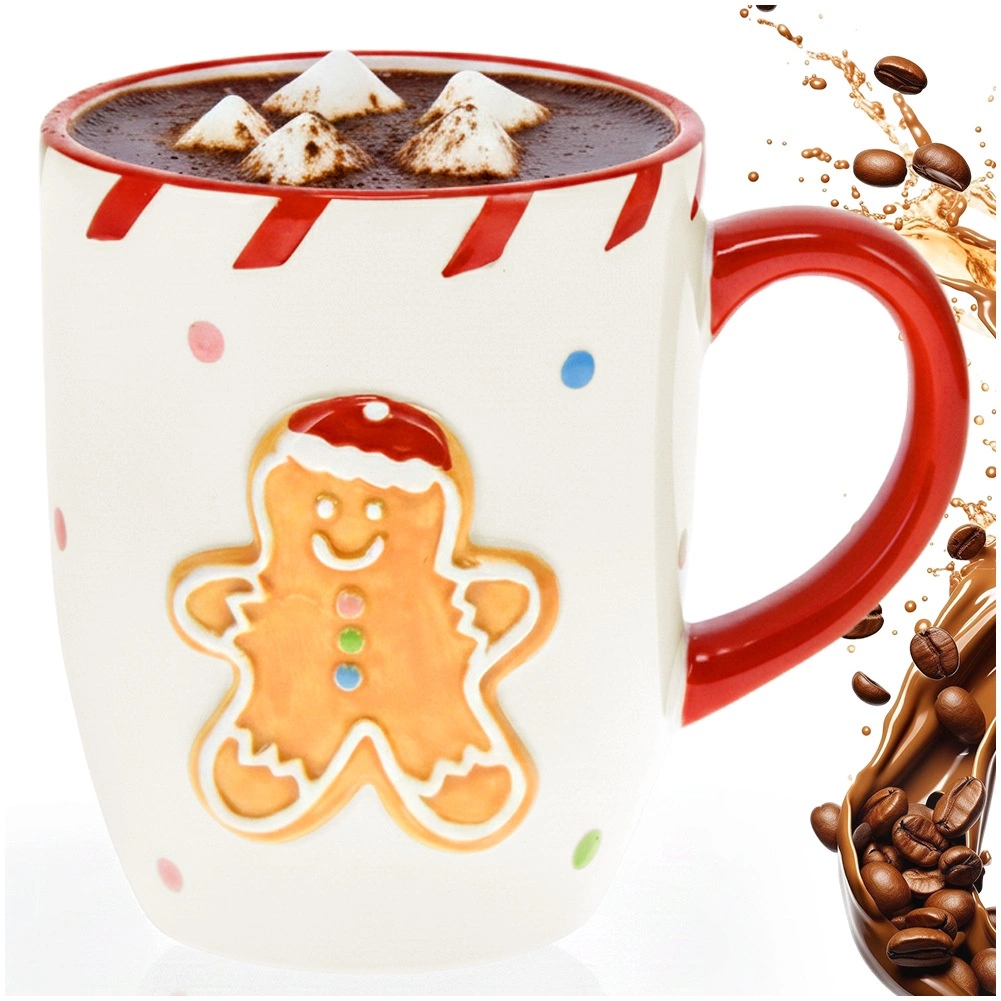 La taza navideña de cerámica con motivo en relieve de muñeco de jengibre aportará un ambiente festivo a tu cocina. La superficie blanca se complementa con un asa roja, un borde a rayas de caramelo y lunares de colores, que le confieren un aspecto juguetón. La capacidad de 330 ml es ideal para té, café, capuchino y chocolate caliente.