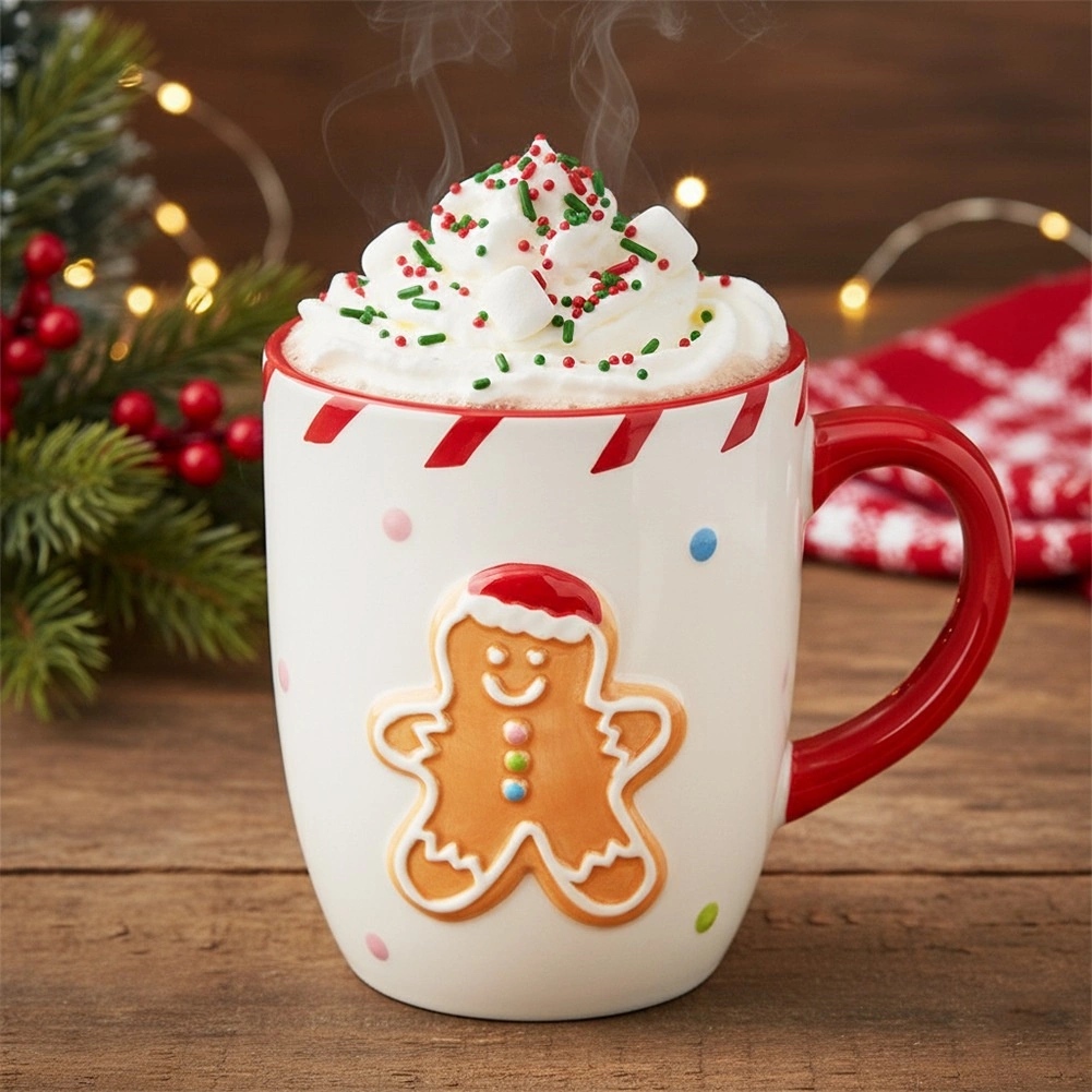 El muñeco de jengibre en relieve y los puntos de colores crean un ambiente navideño acogedor en cada sorbo.