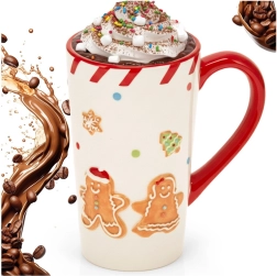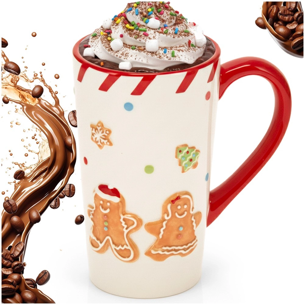 Aporta a tu hogar un ambiente festivo con esta taza alta de cerámica decorada con motivos en relieve de muñecos de jengibre, copos de nieve y árbol de Navidad. El contraste del asa y el borde rojos le da un aspecto llamativo, mientras que su forma alta ofrece una generosa capacidad de 570 ml para tus bebidas calientes favoritas.