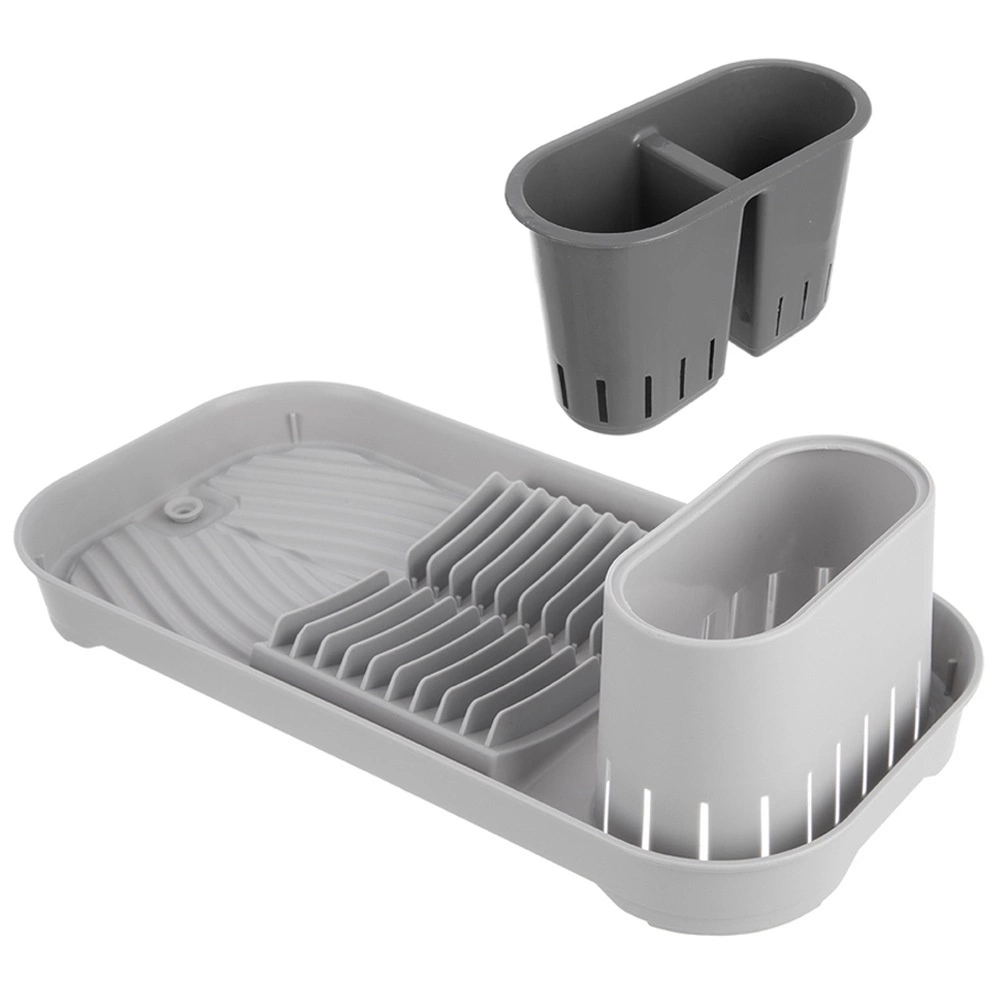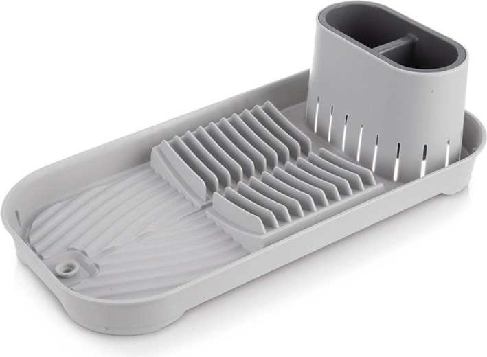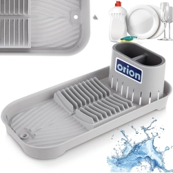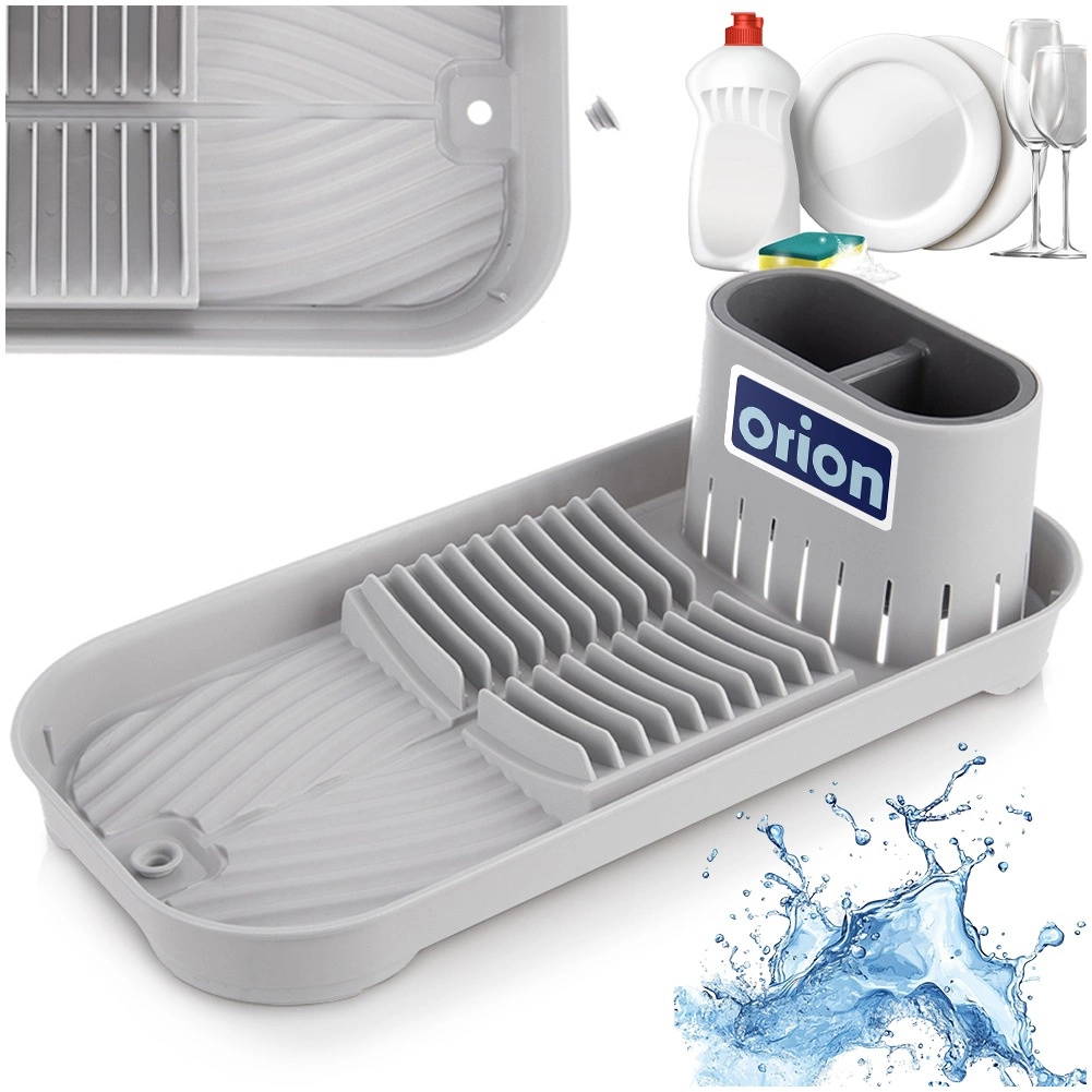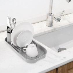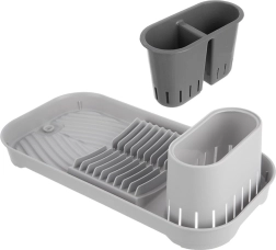 Este práctico escurreplatos es ideal para cocinas pequeñas, apartamentos o caravanas. Ofrece un secado ordenado de platos, vasos y cubiertos y, gracias a sus dimensiones compactas, ahorra espacio en la encimera. El contenedor doble extraíble para cubiertos facilita la clasificación y la limpieza.