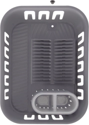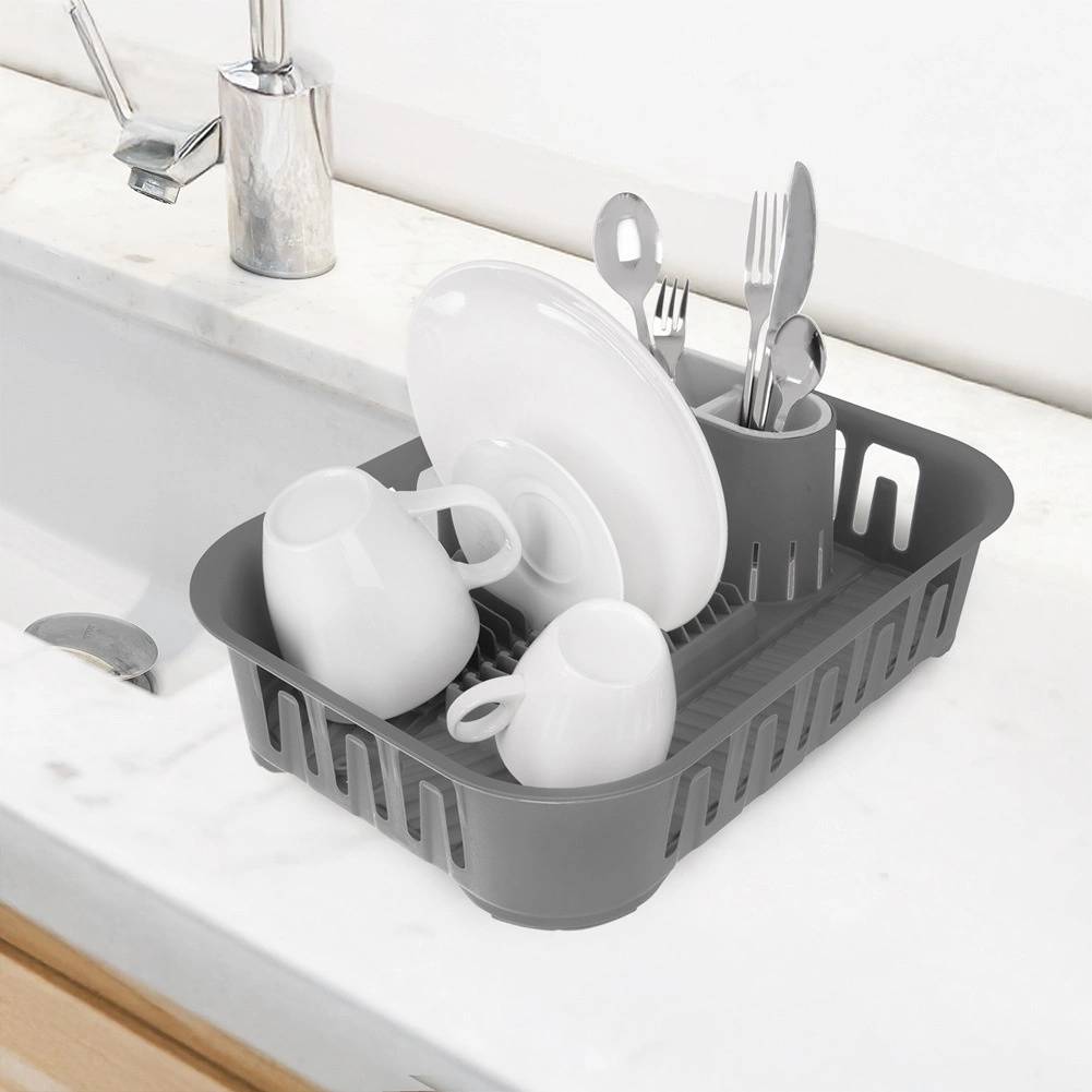 Este ingenioso escurreplatos en elegante color gris facilita el secado de platos, tazas y cubiertos lavados, a la vez que protege la encimera del agua. Dispone de una base diseñada con desagüe integrado y tapón, por lo que no necesitas una bandeja adicional. Incluye una caja extraíble para cubiertos con dos compartimentos para una organización cómoda.