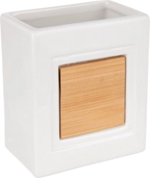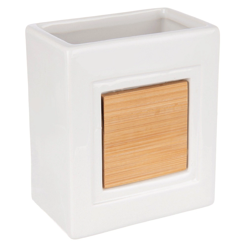Superficie blanca brillante con panel de bambú que aporta elegancia y mantiene los cepillos y pequeños objetos a mano.