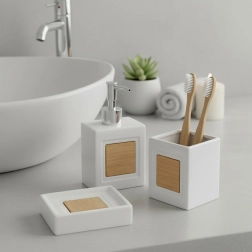Este juego de diseño armoniza el espacio del lavabo y le aporta un aspecto limpio y moderno. La dolomita de alta calidad en blanco brillante se complementa con un acento de bambú natural que aporta calidez a cualquier baño. Sus dimensiones prácticas y detalles bien pensados facilitan el uso y mantenimiento diarios.