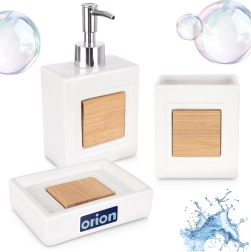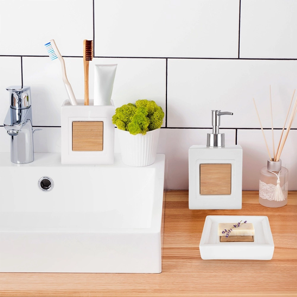 El set incluye un dispensador de jabón líquido con dosificación precisa, un vaso para cepillos o accesorios de belleza y una jabonera para apoyar de forma higiénica la pastilla de jabón. Ideal para baño y aseo: ayuda a mantener el orden y una apariencia elegante.