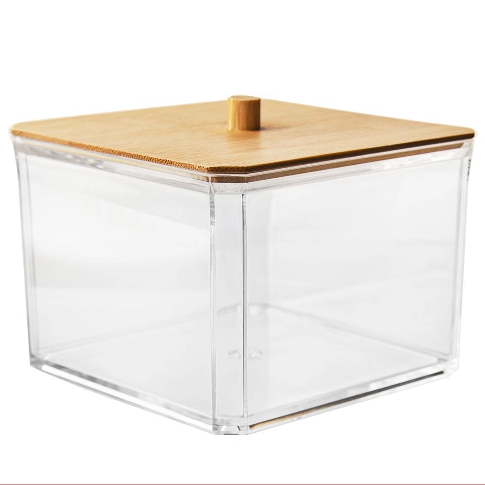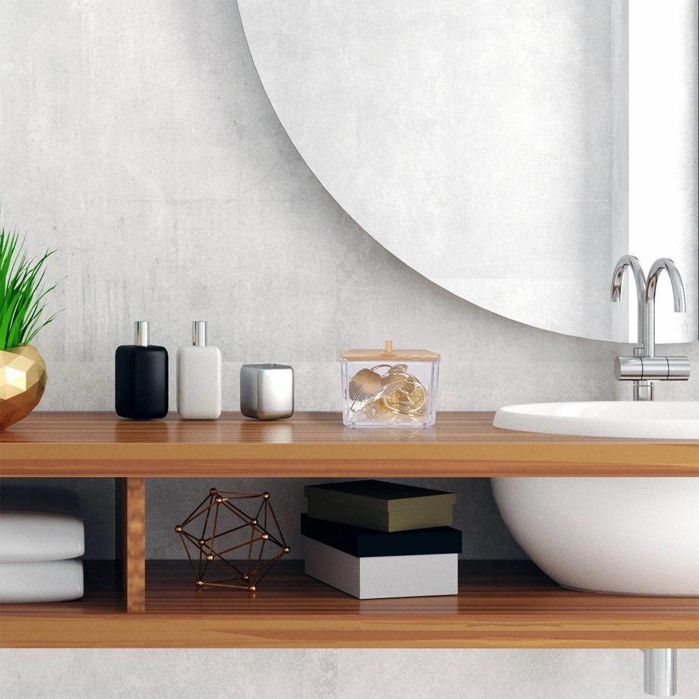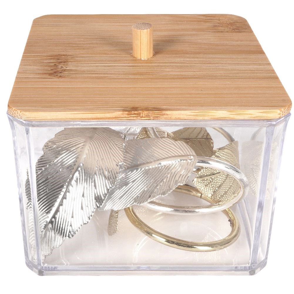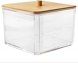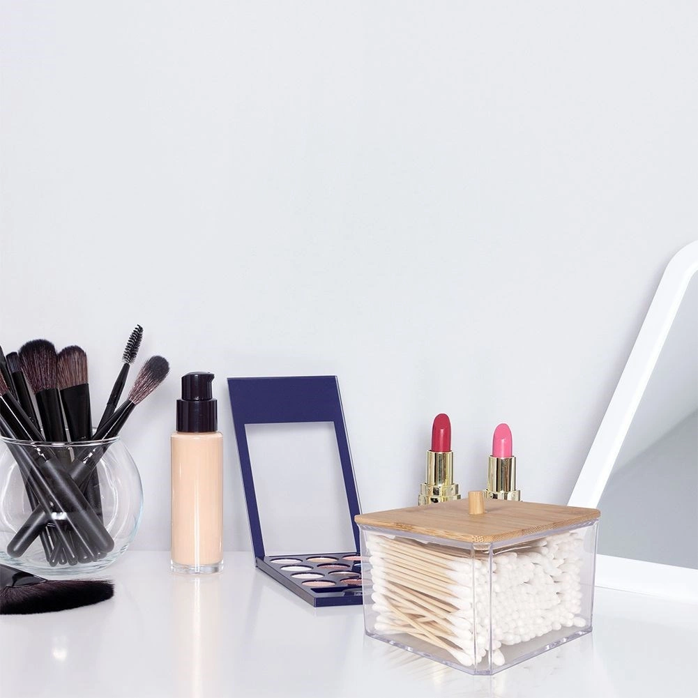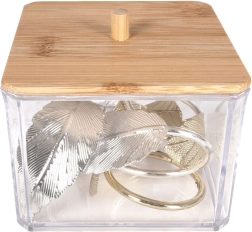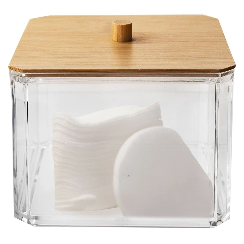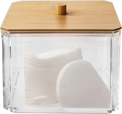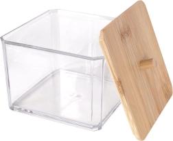 Esta elegante caja para bastoncillos combina paredes transparentes de plástico resistente y el aspecto natural de la tapa de bambú con un práctico tirador. Es ideal para el baño, el dormitorio o el rincón de cosmética: mantiene los pequeños objetos ordenados y sin polvo.