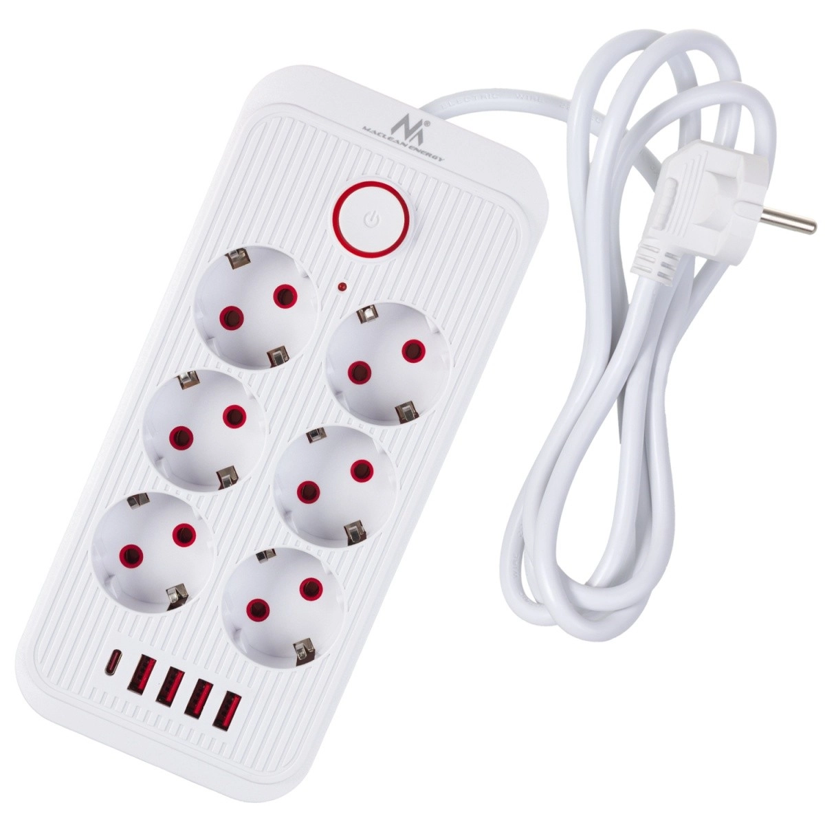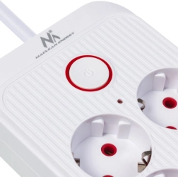 El botón integrado con indicador permite apagar o encender todos los dispositivos conectados con una sola pulsación. Las persianas de protección infantil evitan contactos accidentales.