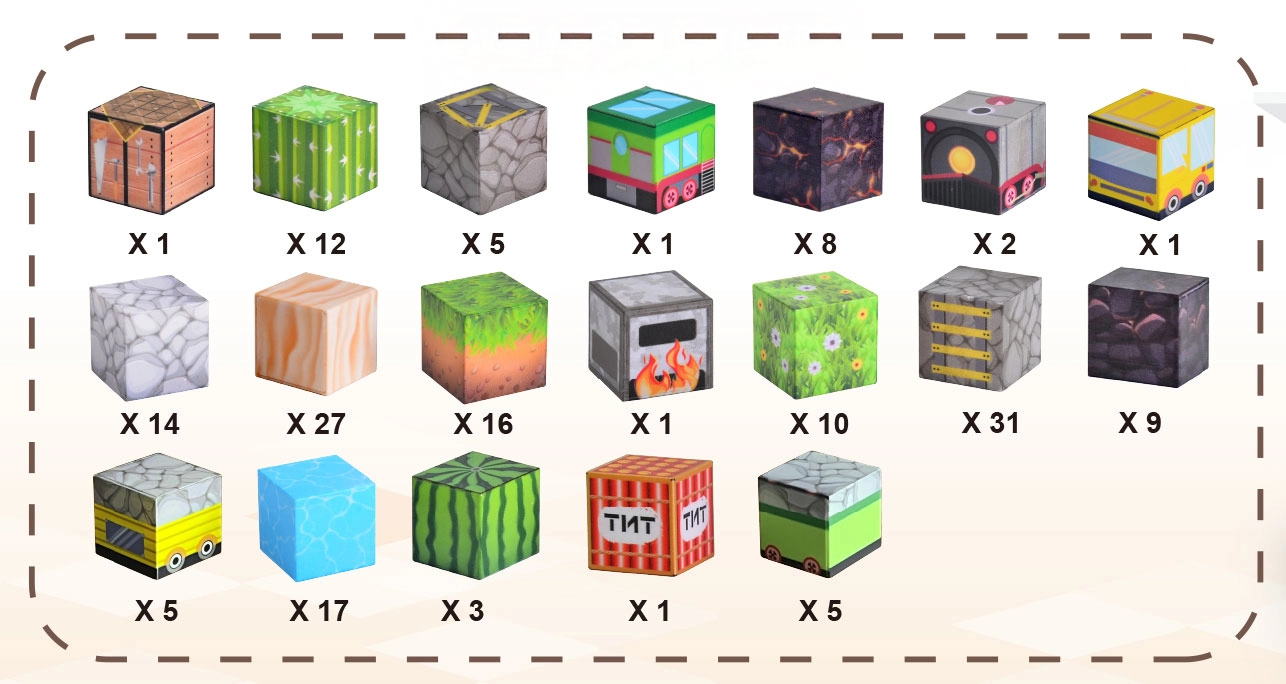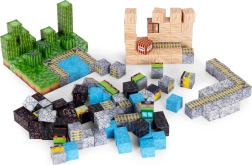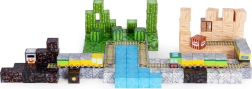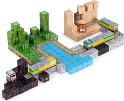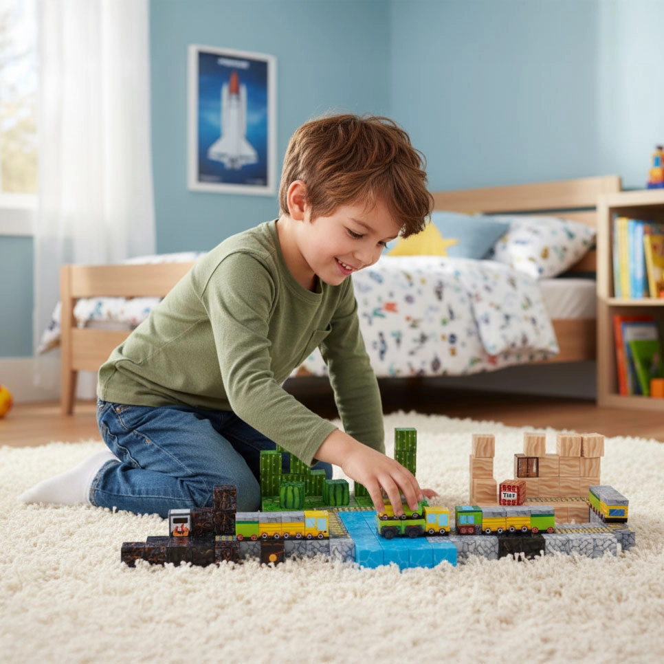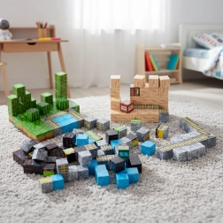 Bloques de colores con estampados de césped, agua, madera y piedra permiten construir paisajes, puentes y vías para un juego sin límites.