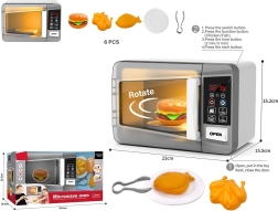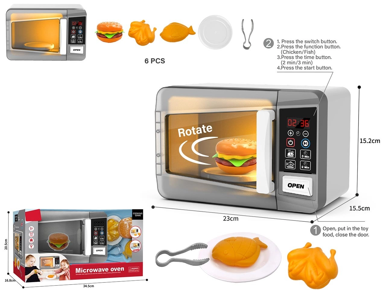 Este microondas infantil brinda a los niños una experiencia de cocina auténtica. Al pulsar el botón START se ilumina el interior, se pone en marcha el plato giratorio y suenan efectos de sonido que imitan el funcionamiento real.