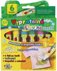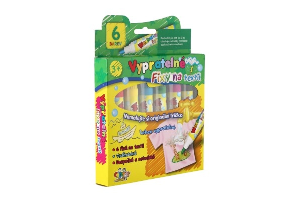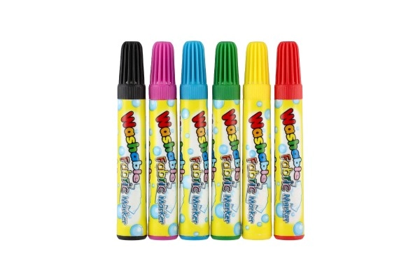 El set incluye 6 rotuladores: rojo, amarillo, azul, verde, rosa y negro. Perfectos para decorar camisetas, bolsas y accesorios.