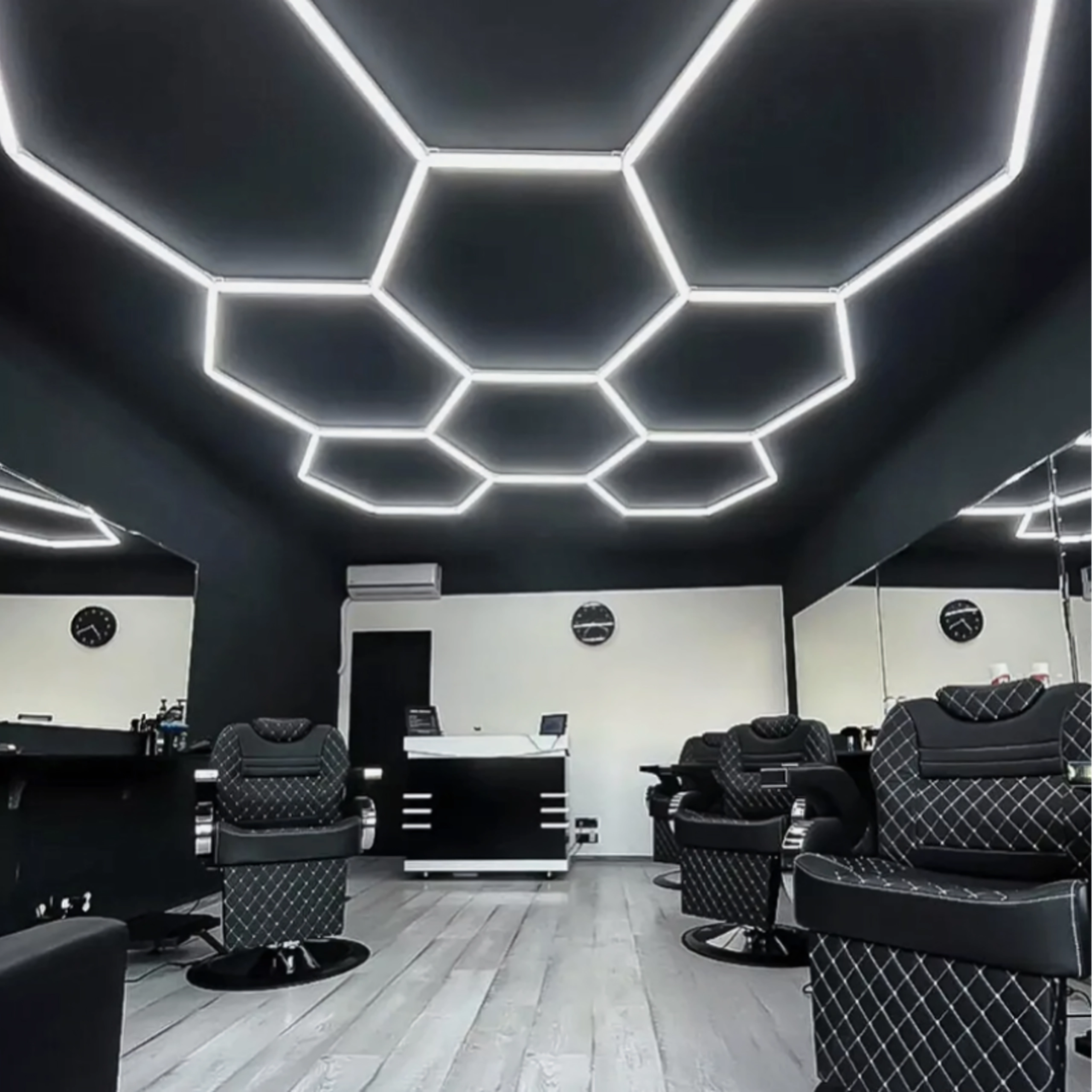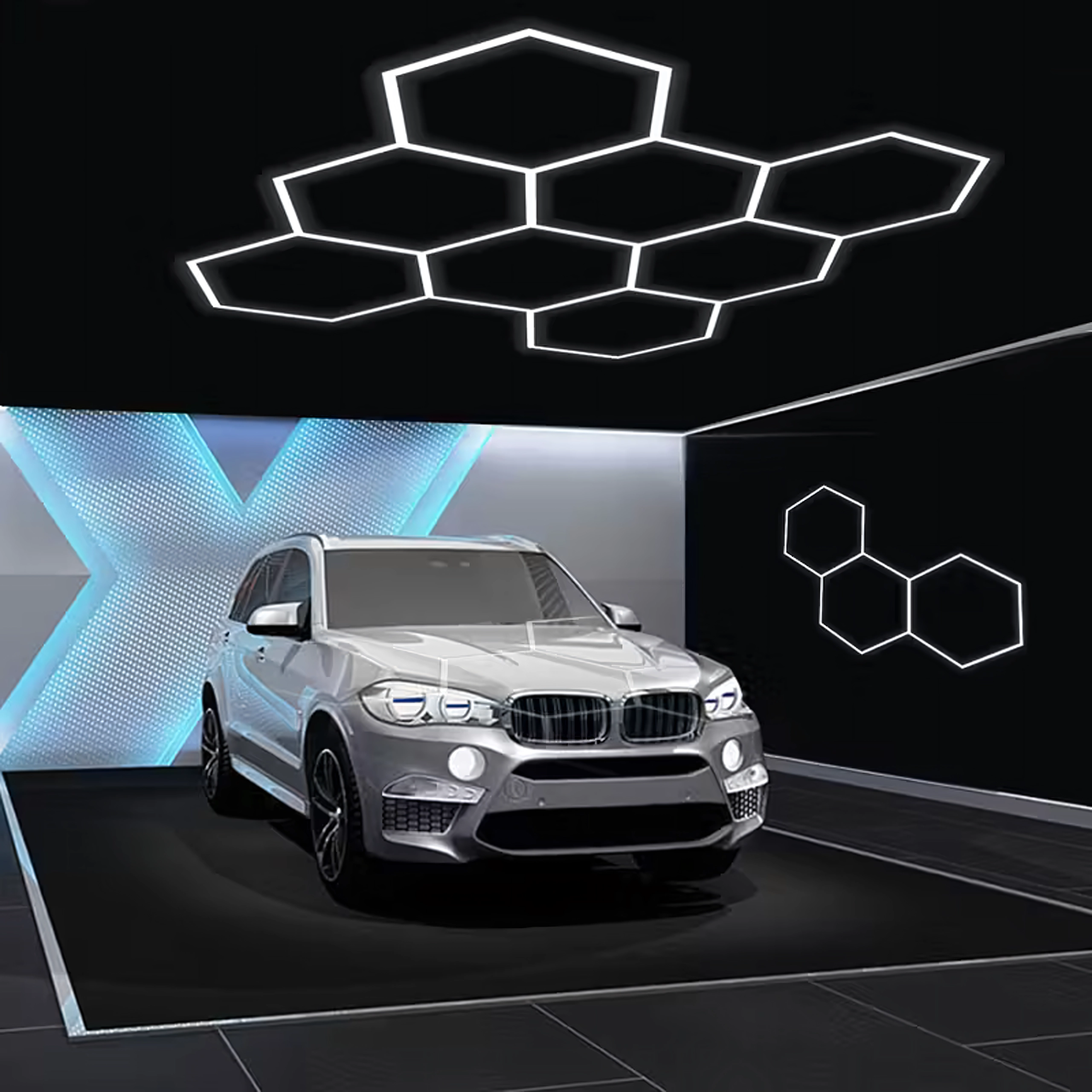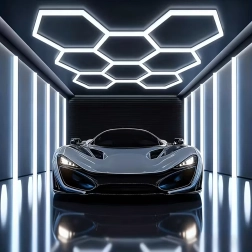 El panel LED hexagonal está compuesto por una estructura modular que genera un impactante patrón inspirado en el panal. Gracias a su alta potencia de 280 W y temperatura de color fría de 6500K, ofrece una luz intensa, limpia y uniforme para trabajar y presentar vehículos, productos o interiores. Elección ideal para garajes, boxes de detailing, showrooms, oficinas y hogares modernos.