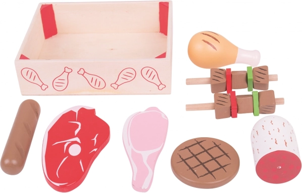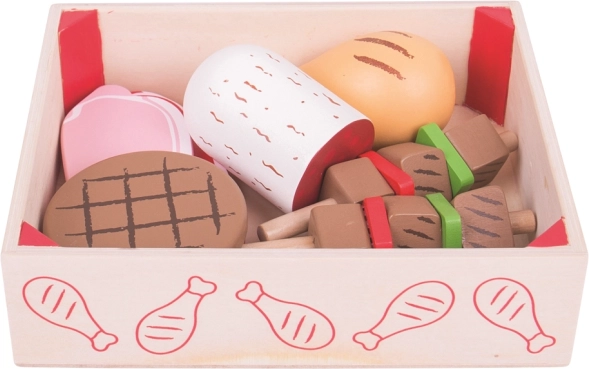 Esta caja de madera de alta calidad está repleta de especialidades “cárnicas” que los niños conocen de la cocina. Encontrarán bacon, bistec, salchicha, pollo y otras piezas con las que prepararán fácilmente un banquete para toda la familia. Después del juego, guardan todo de nuevo en la práctica caja: el orden, en un momento.