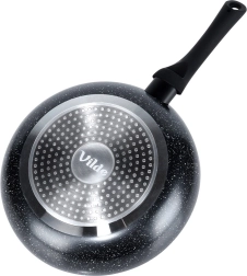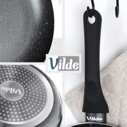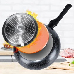 El fondo sólido con distribución uniforme del calor es adecuado para gas, electricidad, vitrocerámica, halógeno e inducción; las sartenes se pueden lavar en lavavajillas.