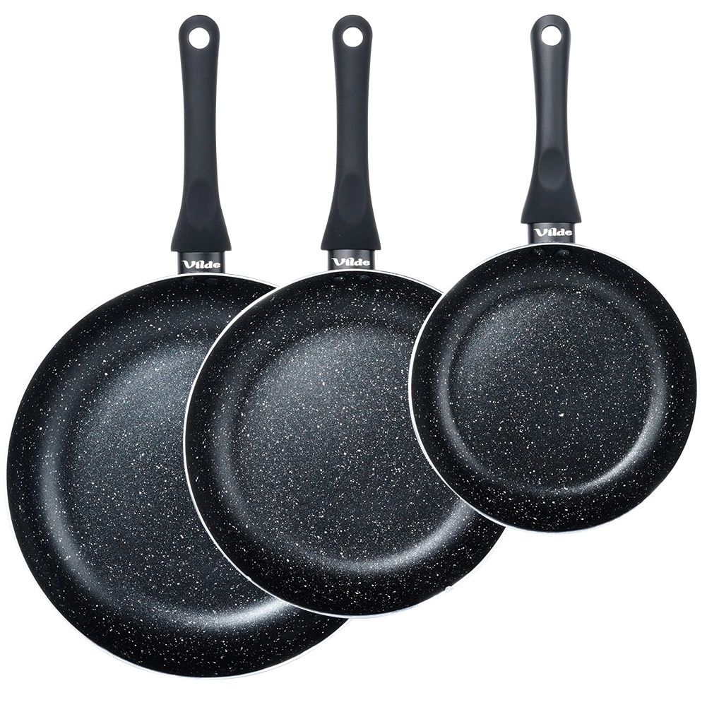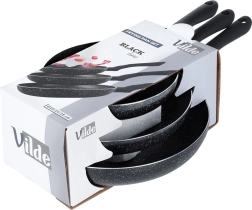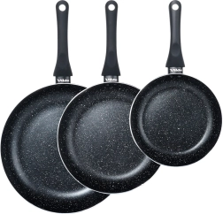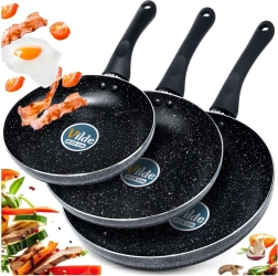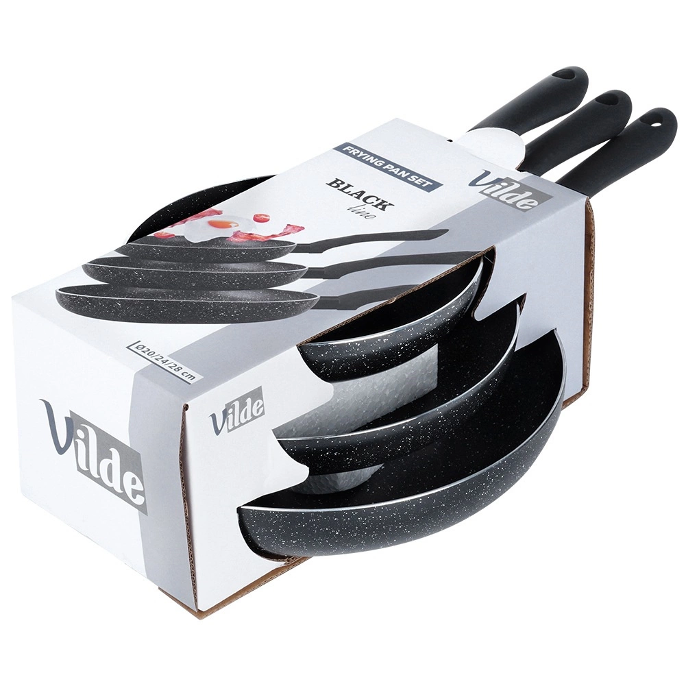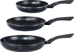 El juego de tres sartenes BLACK LINE combina aluminio fundido de calidad para una rápida distribución del calor y una resistente capa granítica antiadherente para una cocina más saludable. Gracias a los tres tamaños, podrás preparar fácilmente huevos, verduras y filetes, siempre con una distribución uniforme del calor y un desmoldeo sencillo de los alimentos.