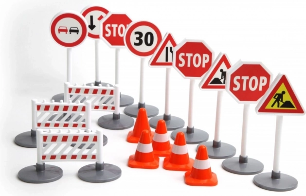 Cada señal mide aproximadamente 16 cm de altura y está fabricada en plástico de calidad y resistencia, preparado para el juego diario en casa o en el jardín de infancia. El set es adecuado como complemento de pistas de coches, alfombras de juego y proyectos temáticos de construcción.