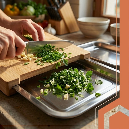 Descubre una tabla de cocina inteligente que agiliza el corte y la limpieza. Dos recipientes deslizables recogen los ingredientes picados o los recortes, para que trabajes de forma limpia y eficiente. La superficie de bambú es firme, resistente a la humedad y a la vez amable con los cuchillos.