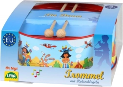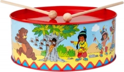 Tambor infantil con motivo indígena y un diámetro de 20 cm que encantará a los pequeños músicos. Está fabricado en metal, complementado con tejido y dos baquetas de madera. Incluye una cuerda para colgarlo del cuello. Favorece el desarrollo de la coordinación, el ritmo y el amor por la música.
