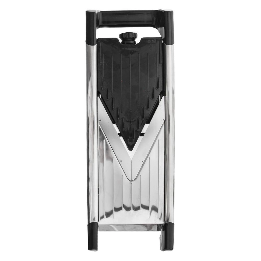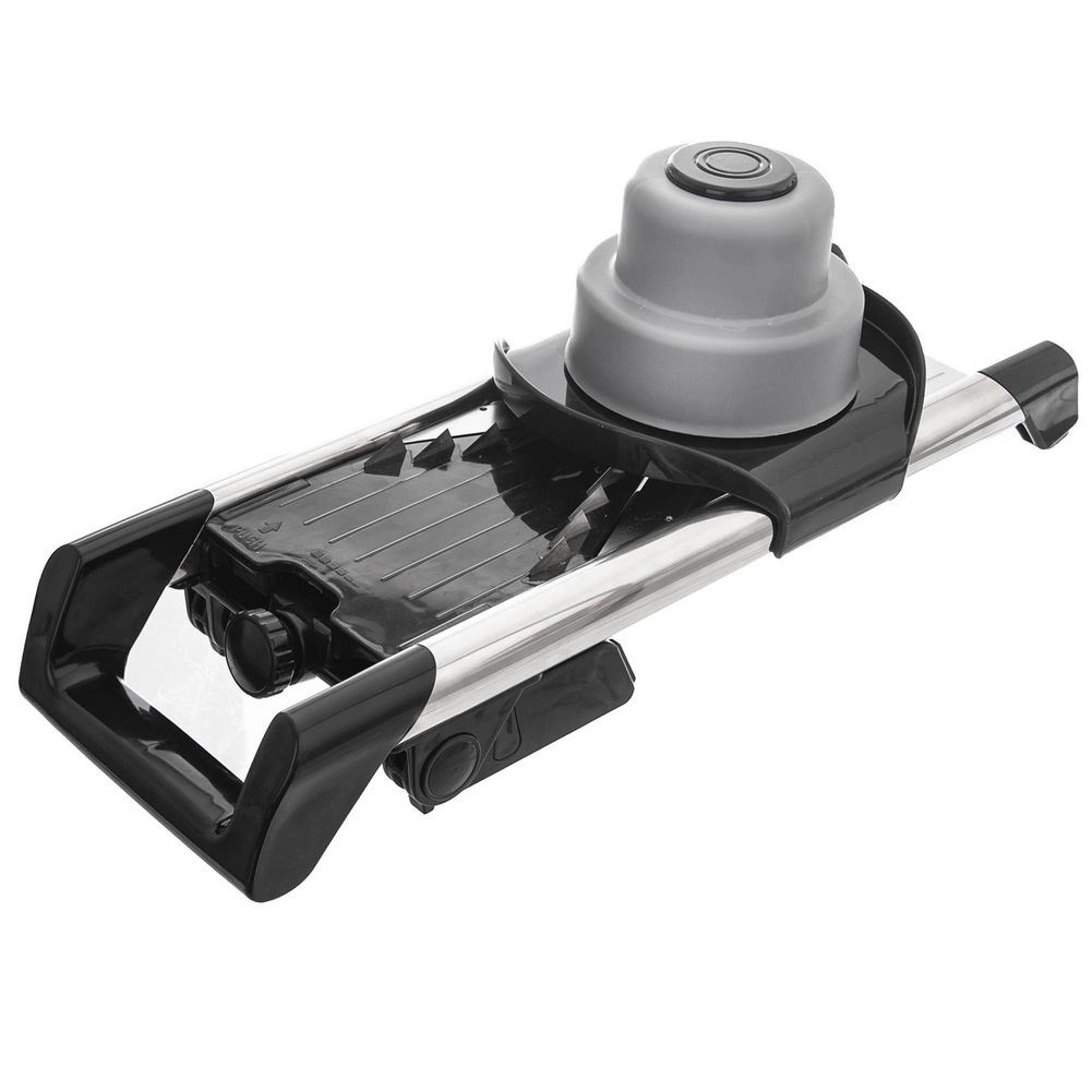 Práctica mandolina de cocina para verduras y frutas con dimensiones de 41 × 13 × 13 cm, ofrece tres insertos intercambiables y regulación continua del grosor de las láminas de 1–6 mm. Gracias a las afiladas cuchillas de acero inoxidable y al soporte de seguridad, corta de forma rápida, precisa y segura. Cuenta con patas antideslizantes plegables, caja de almacenamiento para cuchillas y es apta para lavavajillas.
