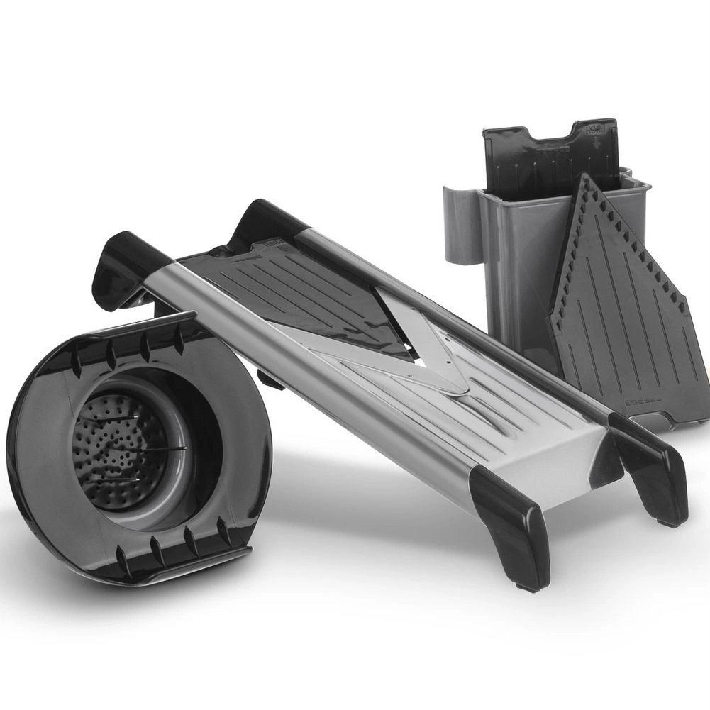 La seguridad está garantizada por el soporte/pusher protector, que resguarda los dedos, y por las patas plegables antideslizantes para una inclinación estable. Los insertos intercambiables se guardan en una caja práctica, por lo que siempre están a mano y protegidos. El cuerpo completo es de plástico resistente en color gris y negro, y el mantenimiento se facilita con la posibilidad de lavar en lavavajillas.