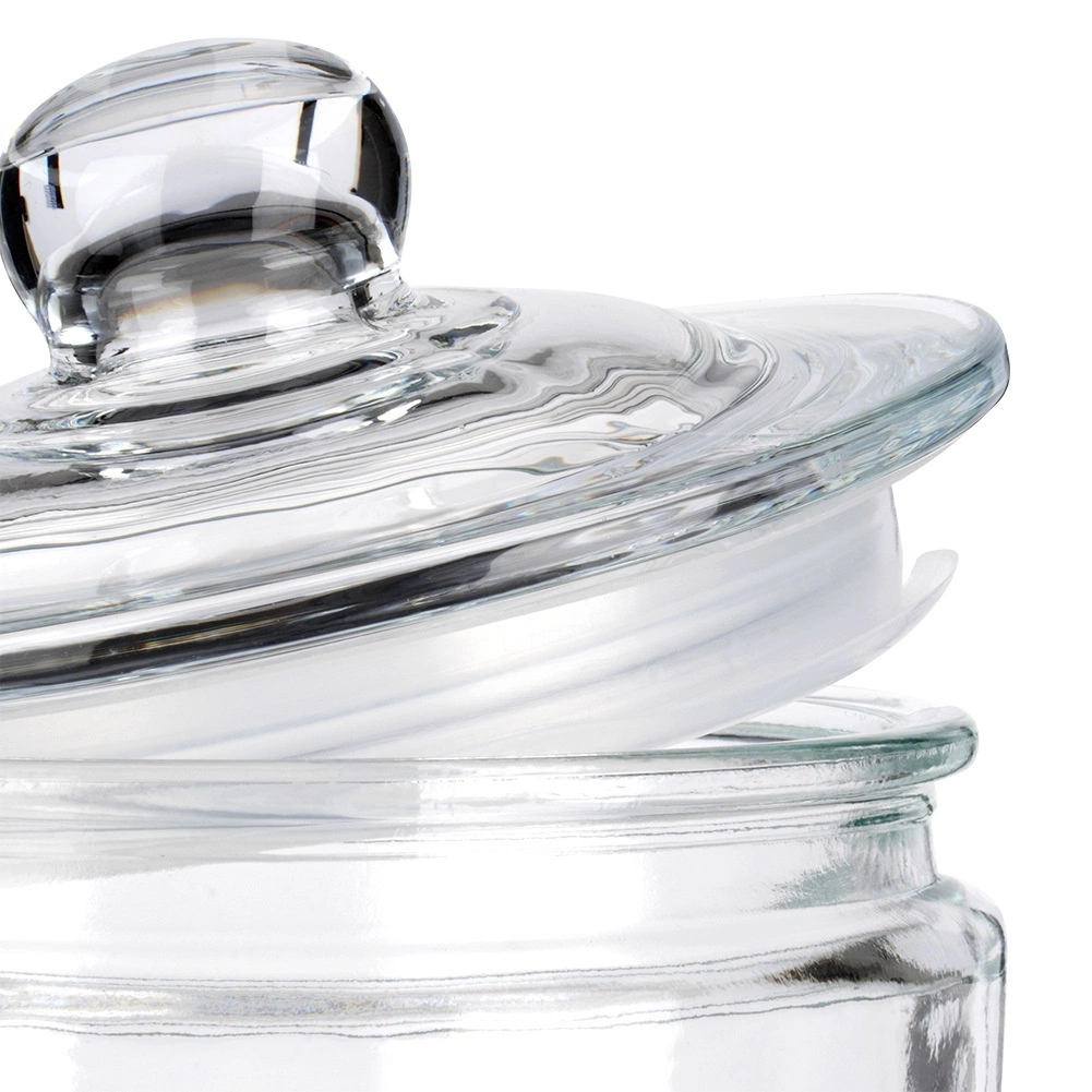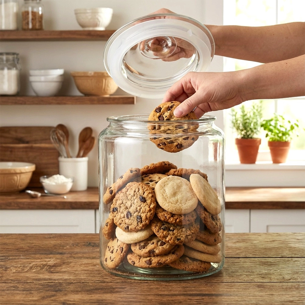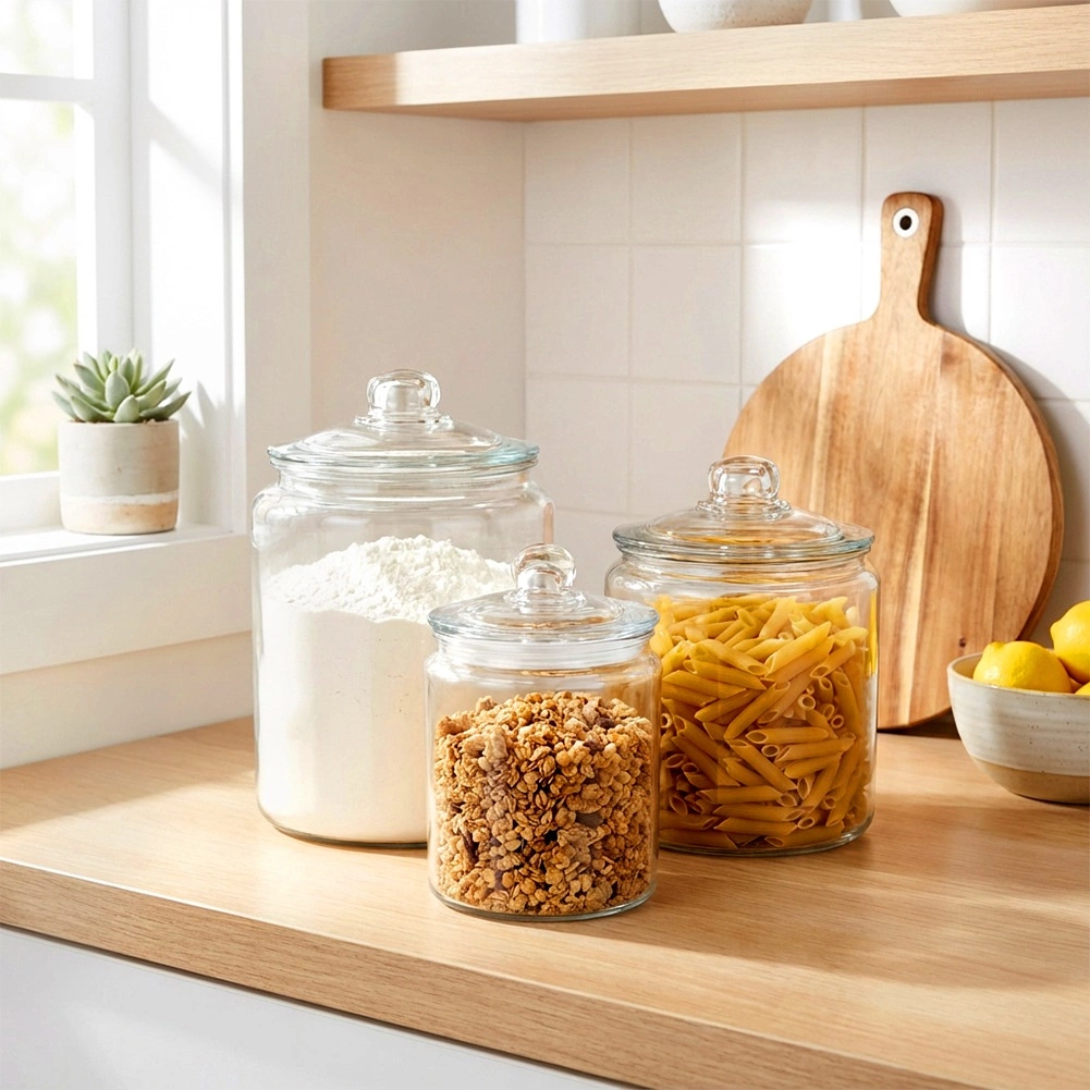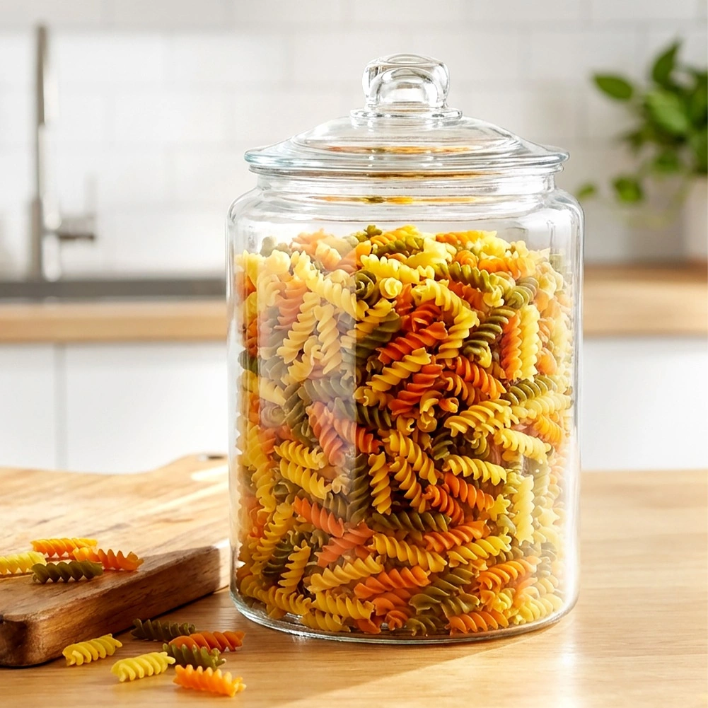 El vidrio claro y resistente permite comprobar al instante el estado de las existencias y luce estupendo con pasta, harina o galletas en la encimera de la cocina.