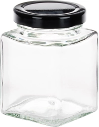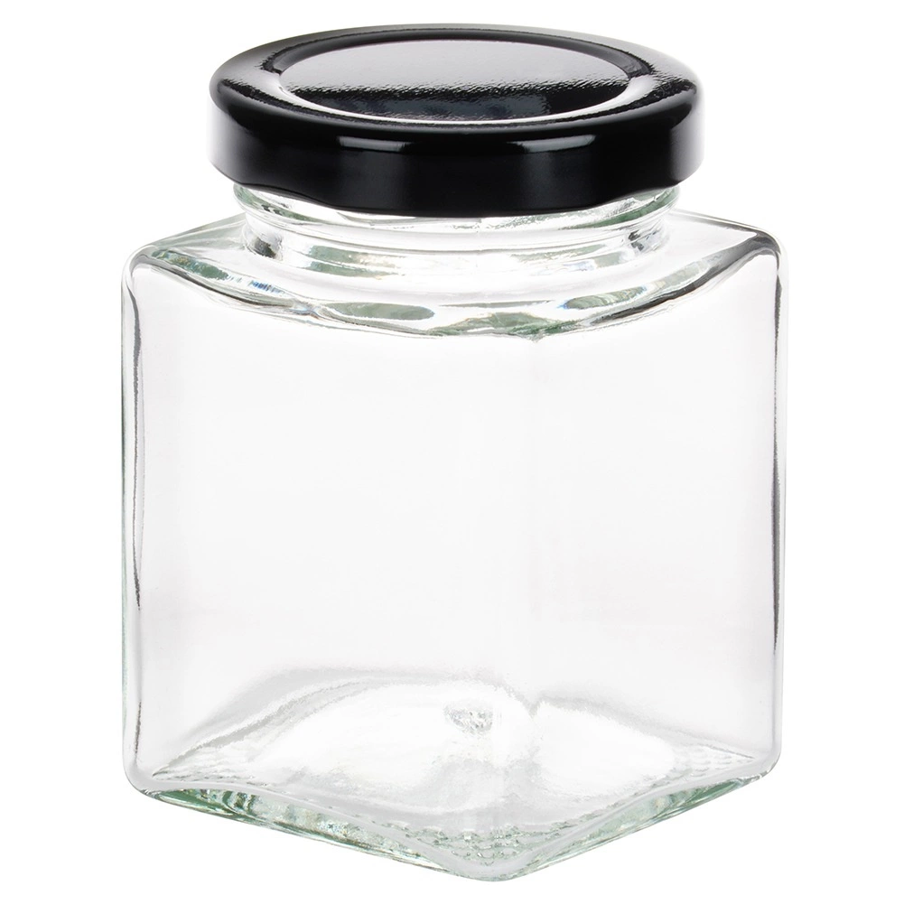 El vidrio transparente permite comprobar el contenido al instante; las tapas metálicas negras con rosca protegen de la humedad y conservan el aroma.