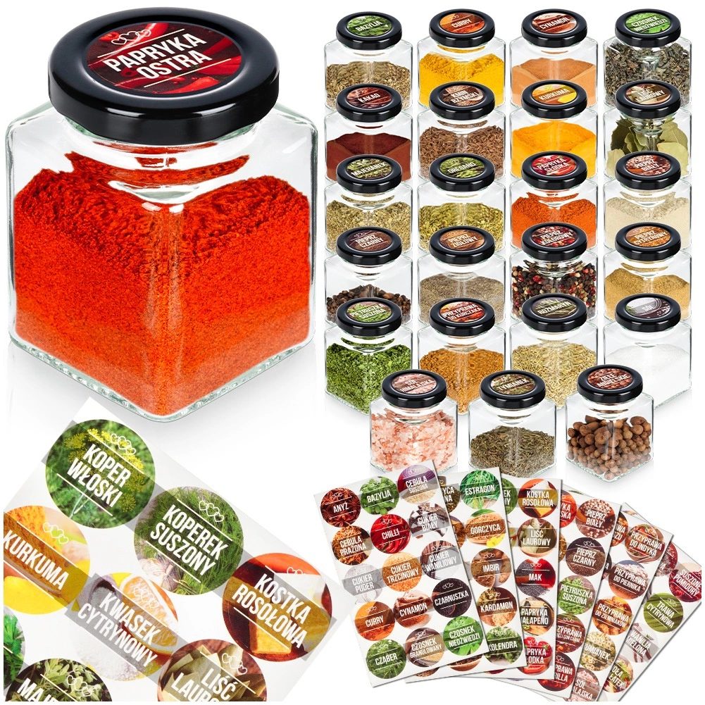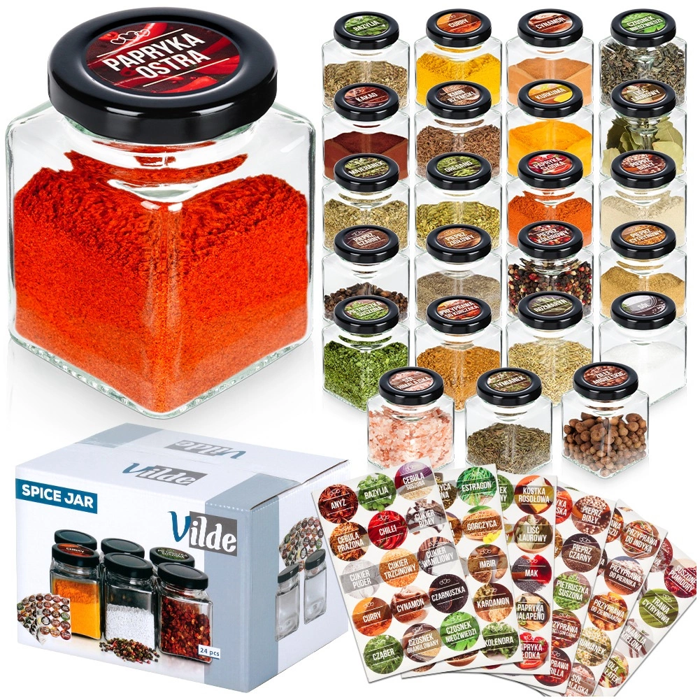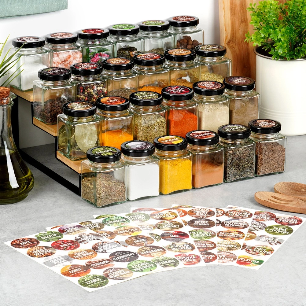 El juego de 24 tarros de vidrio con etiquetas mantiene las especias y hierbas ordenadas sistemáticamente y siempre a mano, desde el cajón hasta el soporte de cocina.