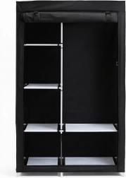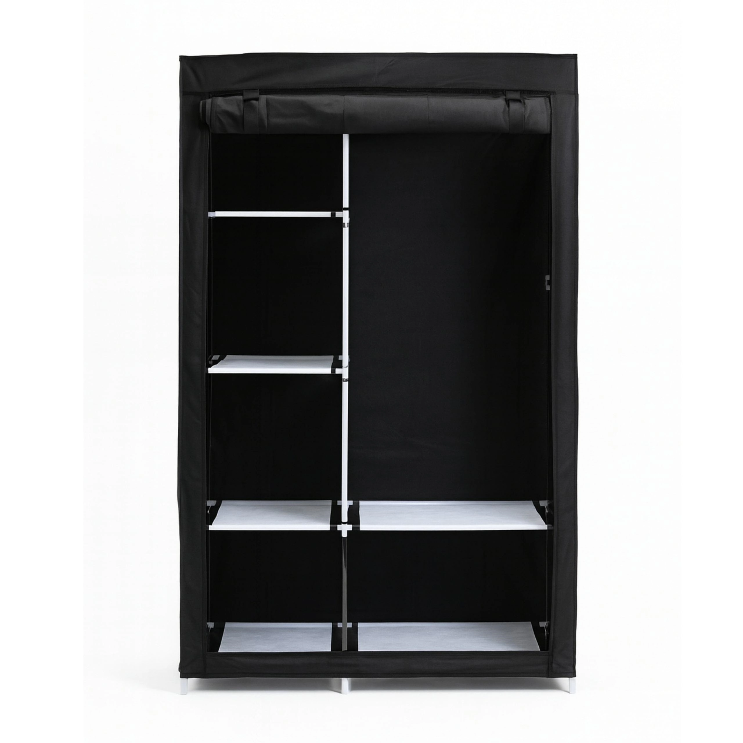 Ligero y práctico armario ropero de tela en elegante color negro, que ofrece una estructura estable, protección de las prendas contra el polvo y una organización bien pensada gracias a los estantes, bolsillos laterales y la barra para perchas. Ideal para el hogar, la oficina y la habitación de estudiantes.