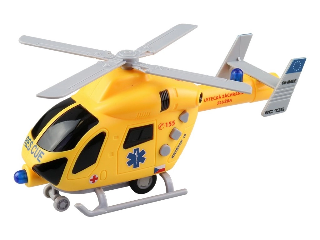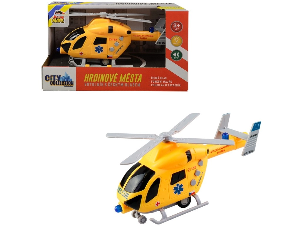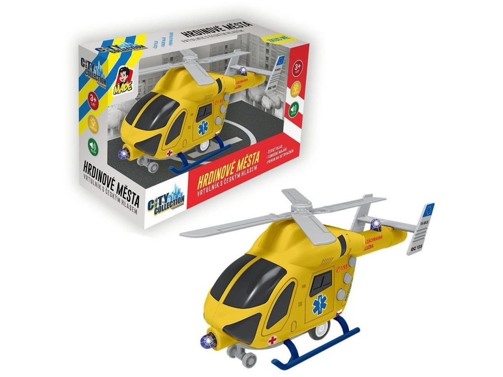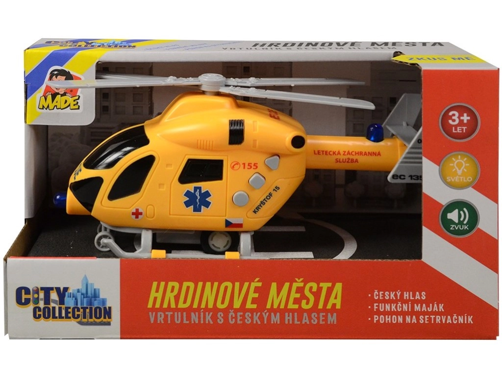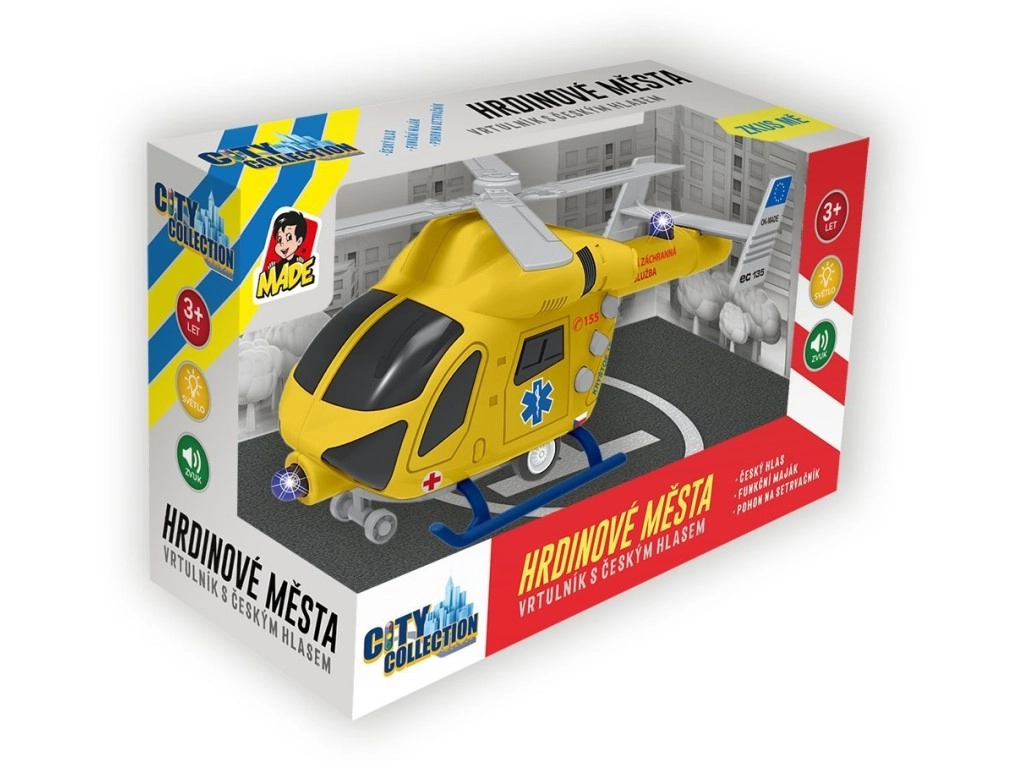 El helicóptero de rescate de la marca checa MaDe destaca por su diseño realista y por los efectos de voz en checo. Gracias a la inercia, los efectos de luz y el farol funcional, ofrece mucha diversión llena de acción para niños a partir de 3 años. Las pilas 3× AG13 están incluidas en el paquete.