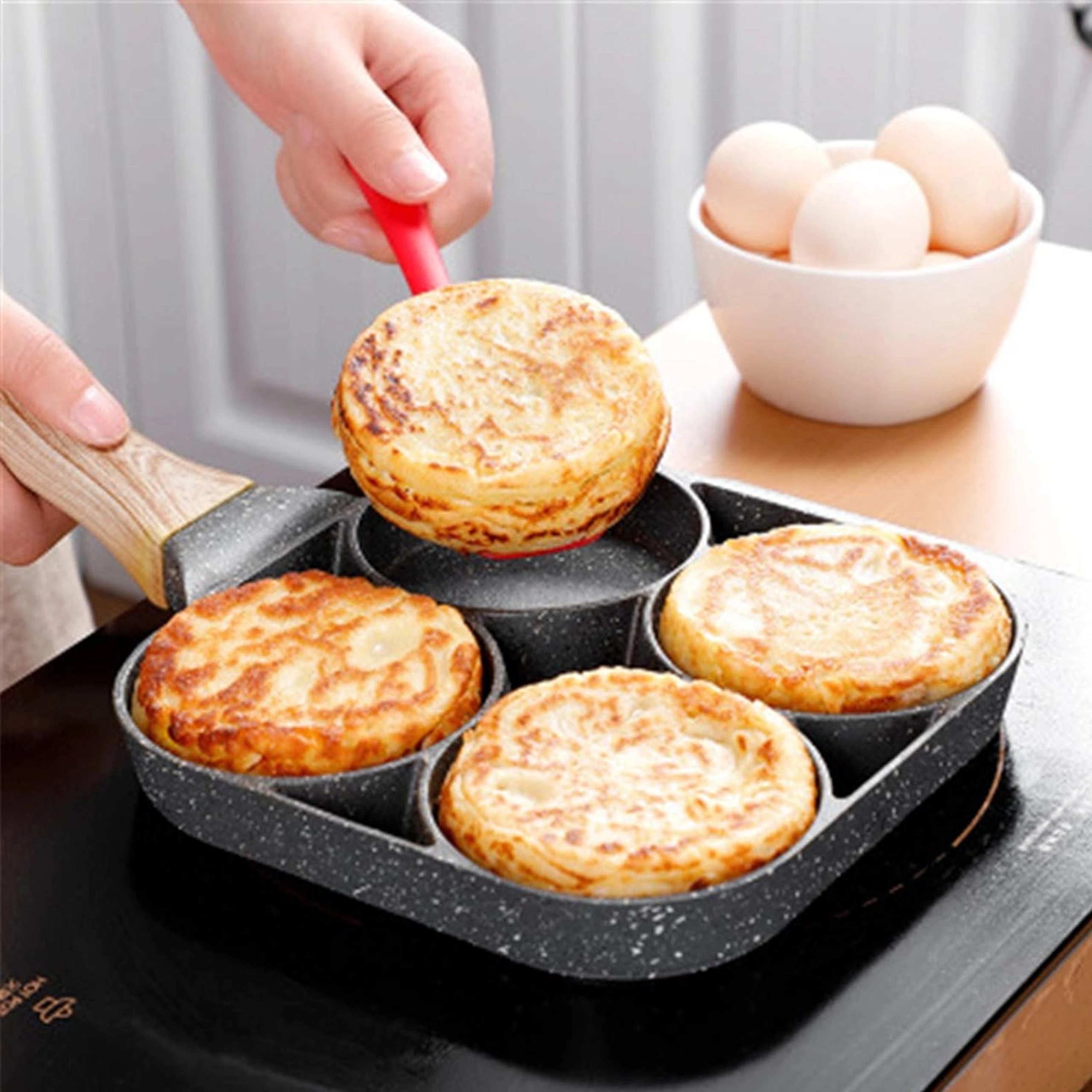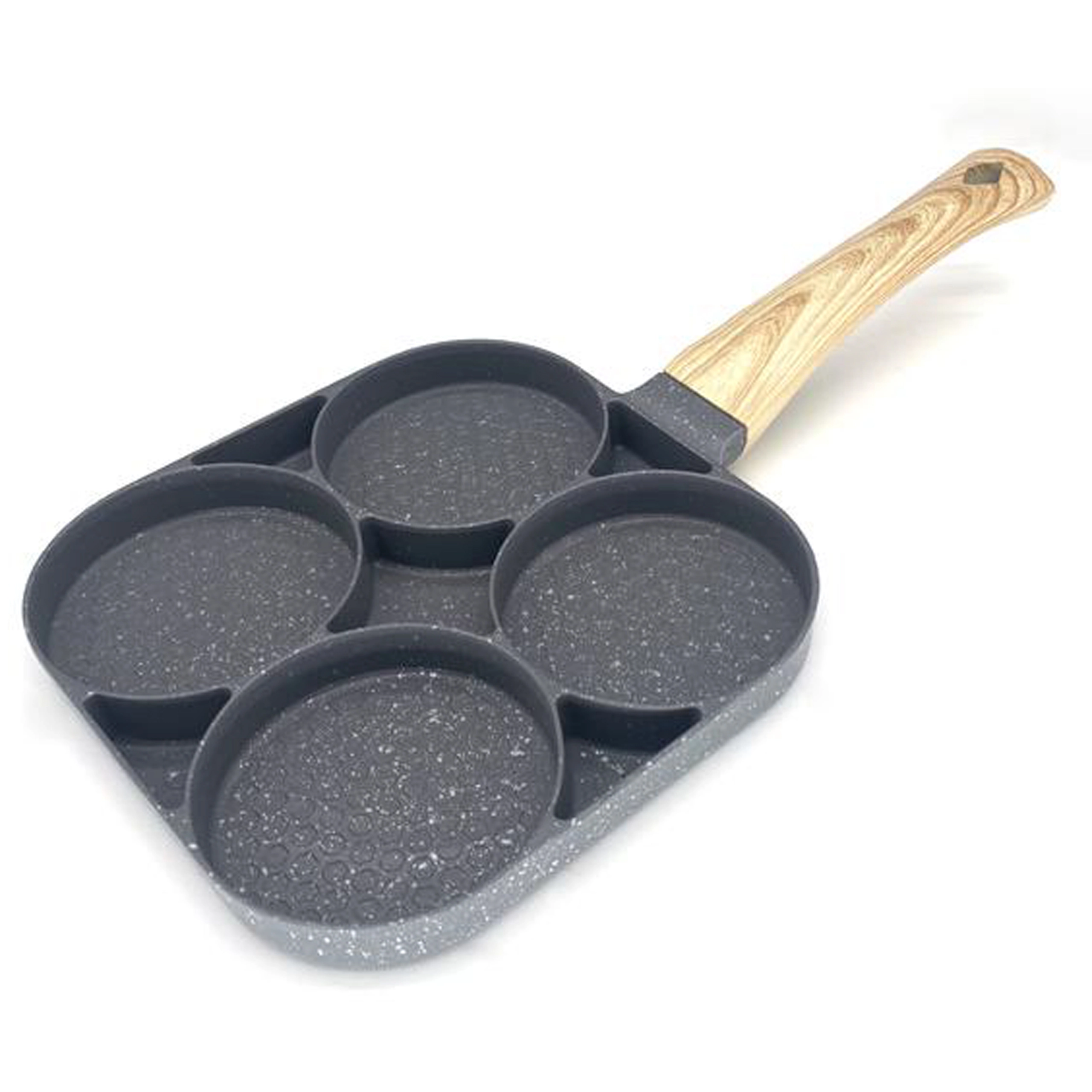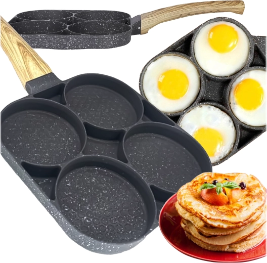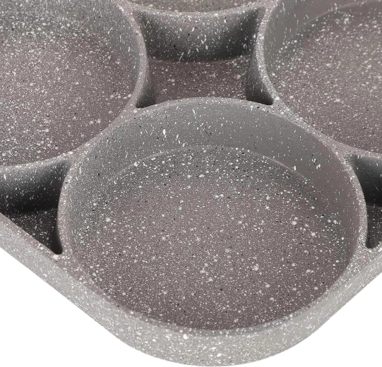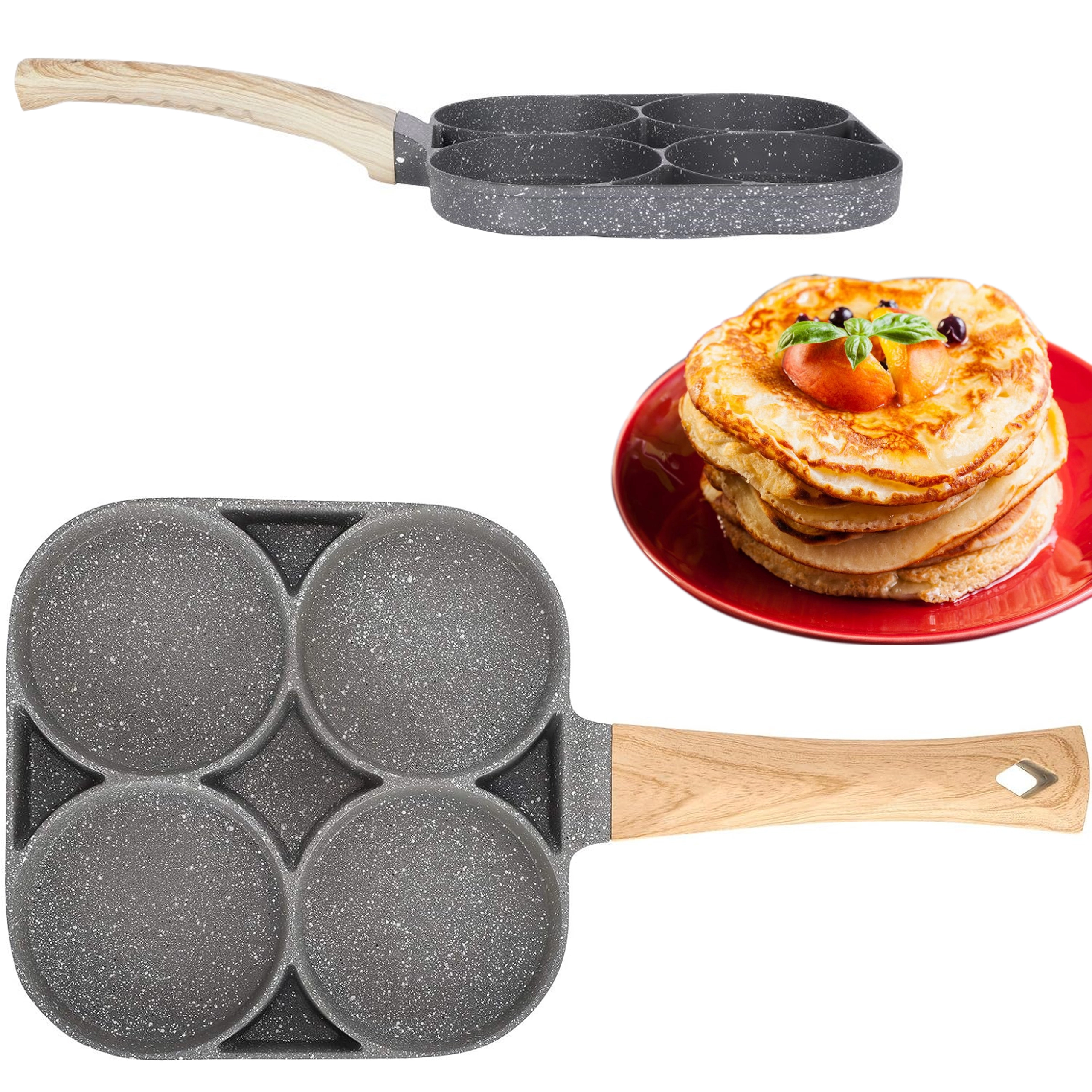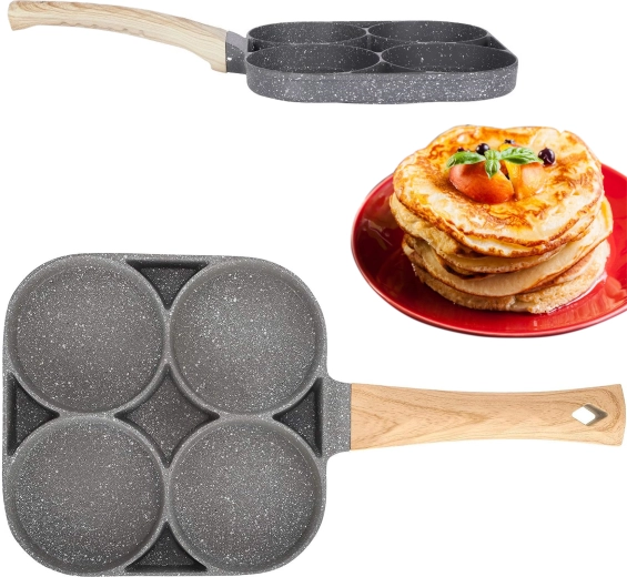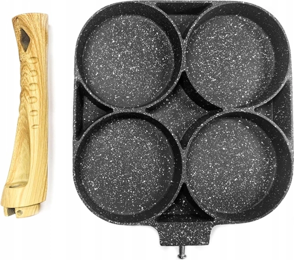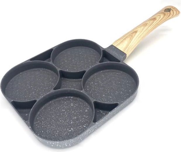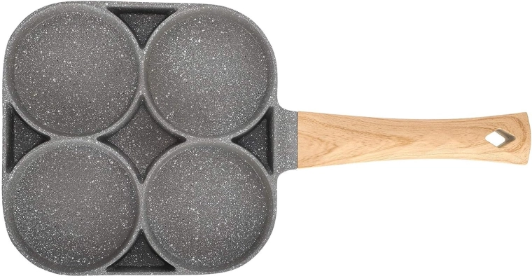 Esta sartén con cuatro secciones es ideal para preparar desayunos y tentempiés de forma rápida y equilibrada. Las cavidades separadas mantienen las porciones bien redondas y uniformes, mientras que el recubrimiento antiadherente moteado asegura un volteo sencillo sin que se pegue y una limpieza fácil.