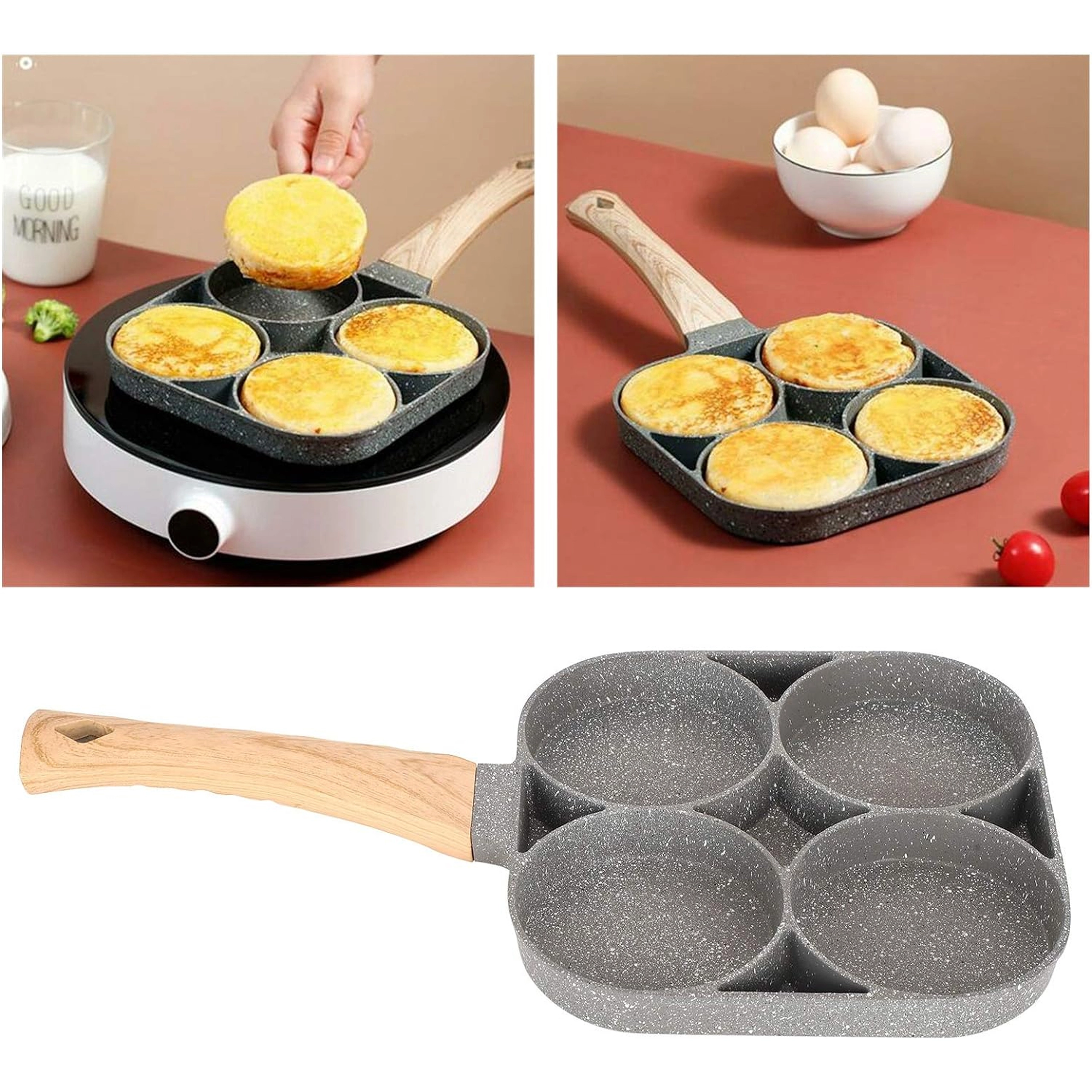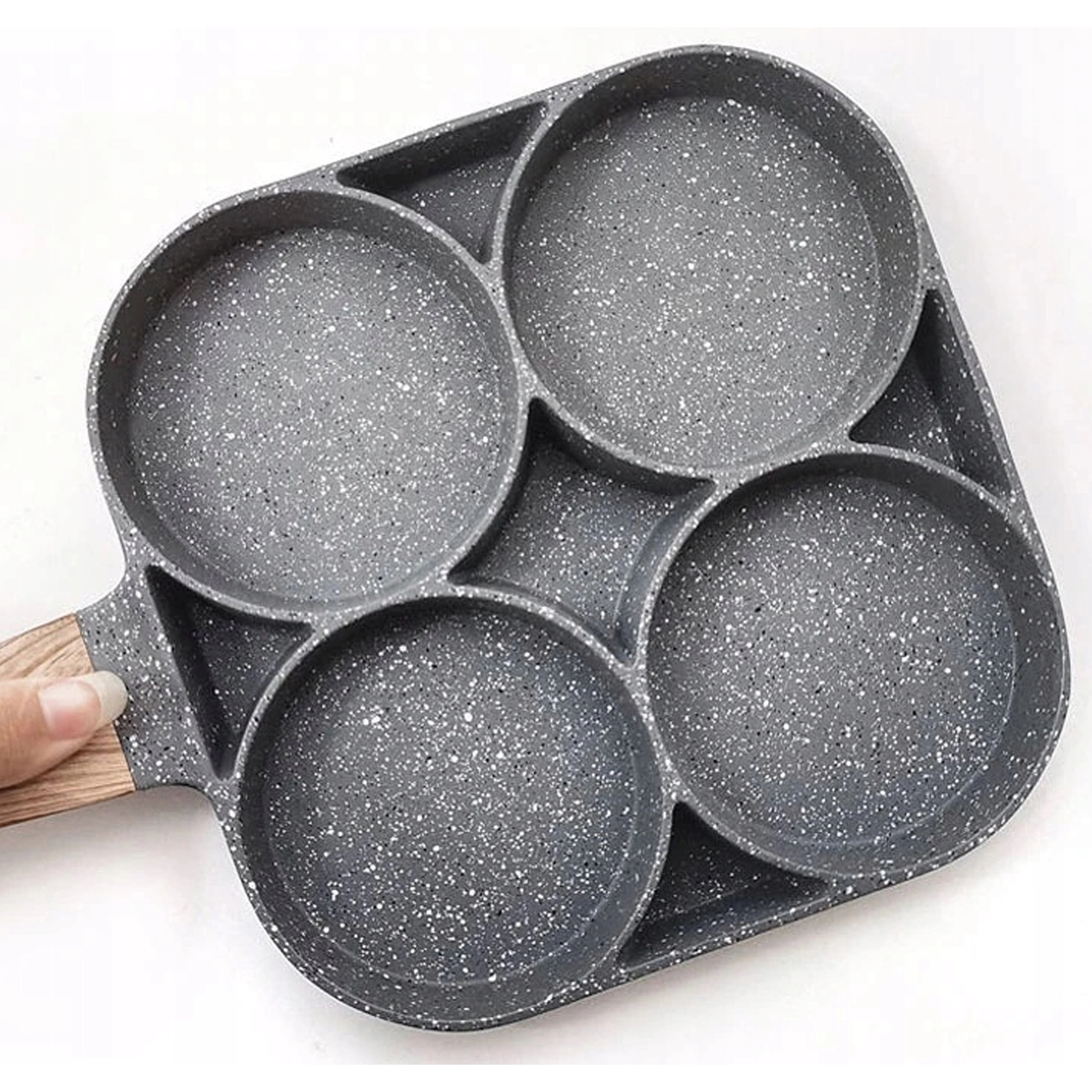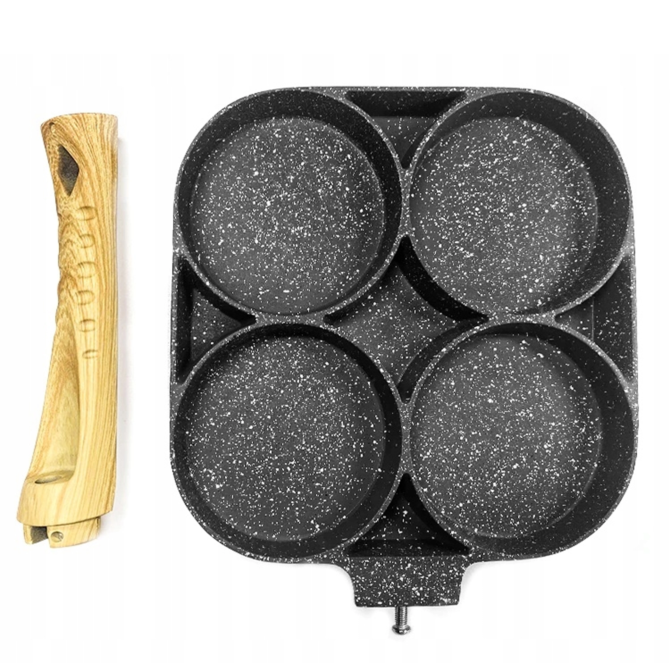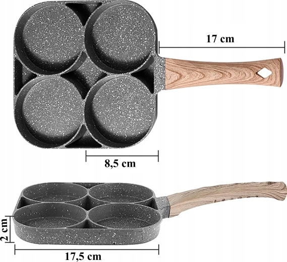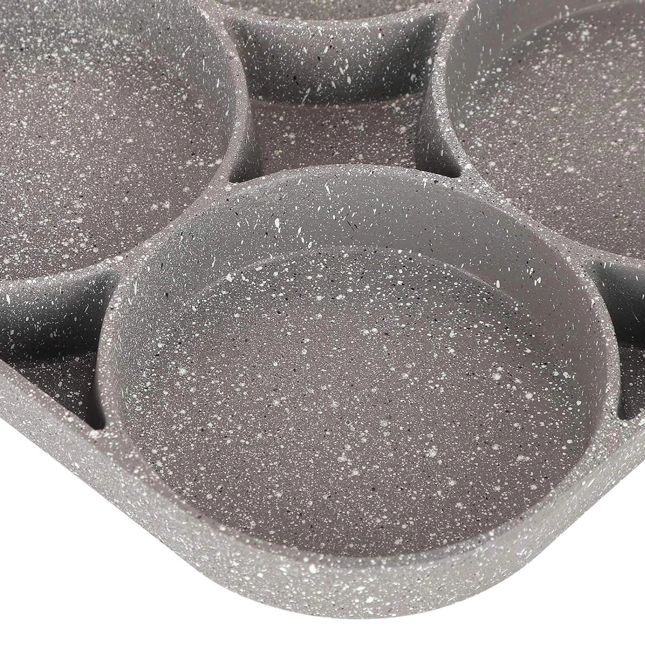 Esta sartén con cuatro secciones es ideal para preparar desayunos y tentempiés de forma rápida y equilibrada. Las cavidades separadas mantienen las porciones bien redondas y uniformes, mientras que el recubrimiento antiadherente moteado asegura un volteo sencillo sin que se pegue y una limpieza fácil.
