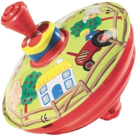 Esta peonza tradicional con motivo de granja es el juguete ideal para los más pequeños. Su sencillo mecanismo de palanca pone la peonza en movimiento, generando un sonido característico y estímulos visuales al girar.