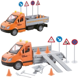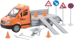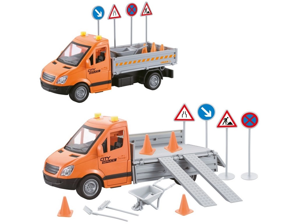 La plataforma con rampas abatibles permite cargar y descargar los accesorios con facilidad. Así, los niños pueden recrear trabajos viales y asistencias de servicio auténticas.