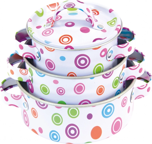 Elegante juego de cocina infantil de metal para pequeños cocineros y cocineras que aporta un juego de cocina realista en casa y al aire libre. Incluye 3 ollas con tapas, sartén, cucharón, colador, espátula y manopla. Su diseño resistente, el colorido estampado de lunares y sus 11 piezas prácticas estimulan la imaginación y desarrollan la motricidad fina.
