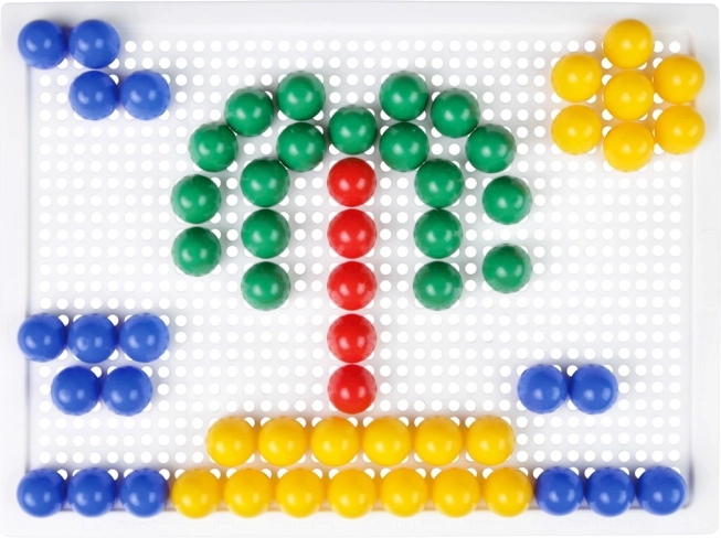 El set incluye una rejilla de plástico de 21 × 16 cm y 80 chinchetas de 15 mm de diámetro. Gracias a sus dimensiones compactas, es ideal para casa y para llevar de viaje. El mosaico no incluye plantillas, fomentando así el juego libre y la imaginación.
