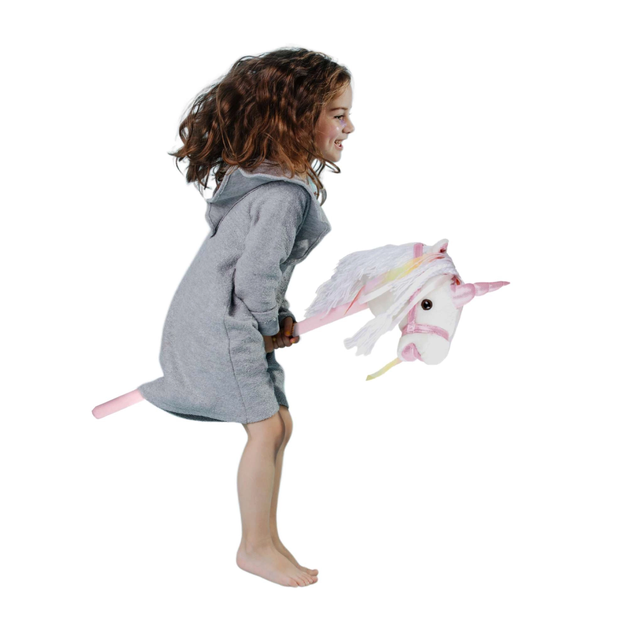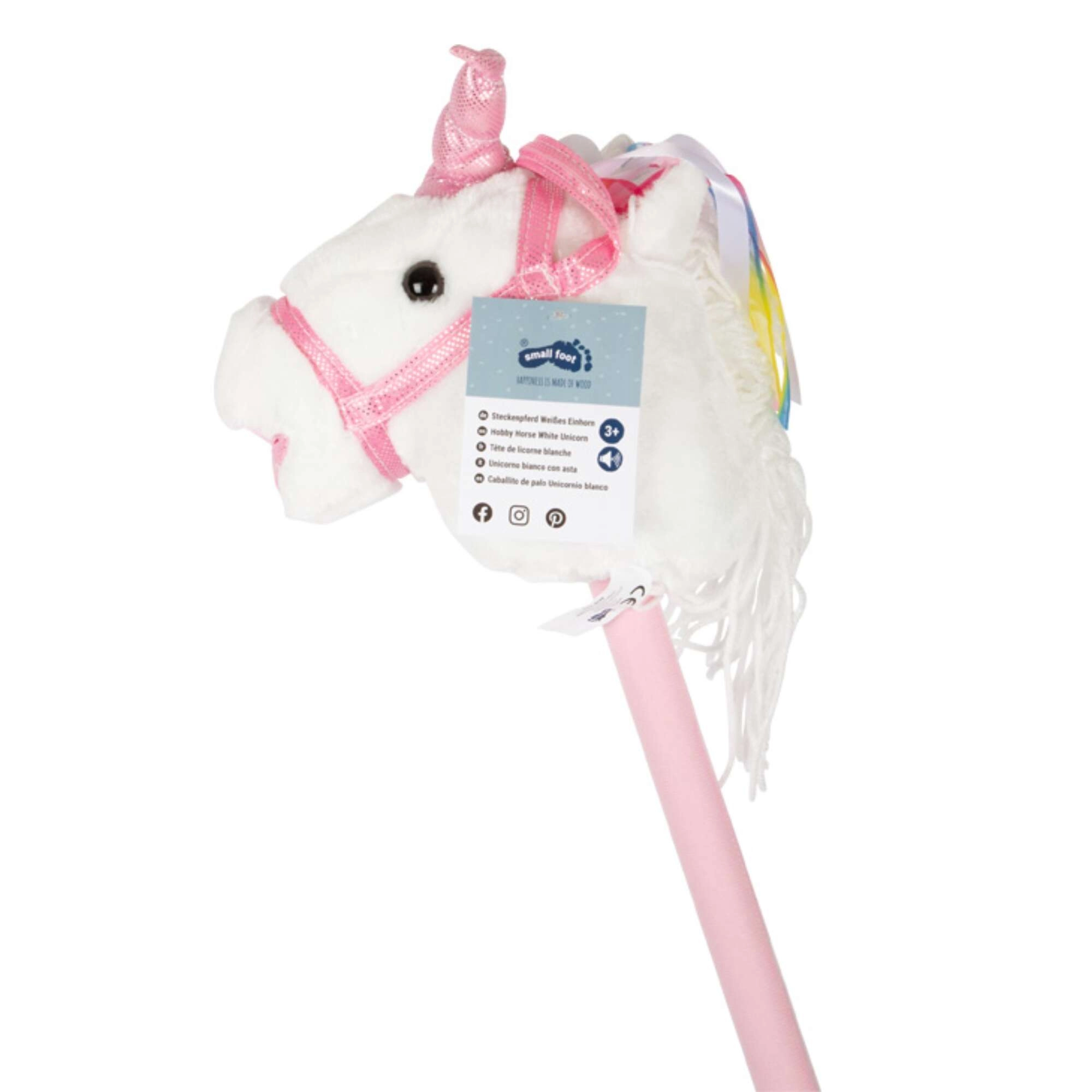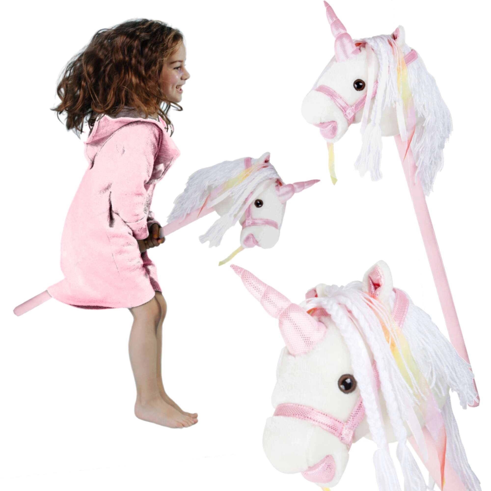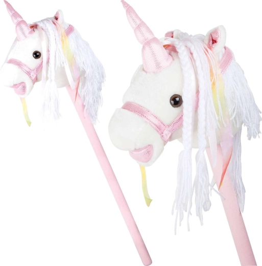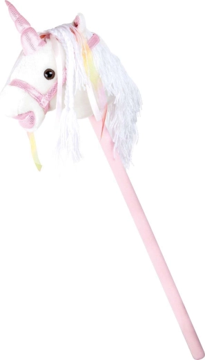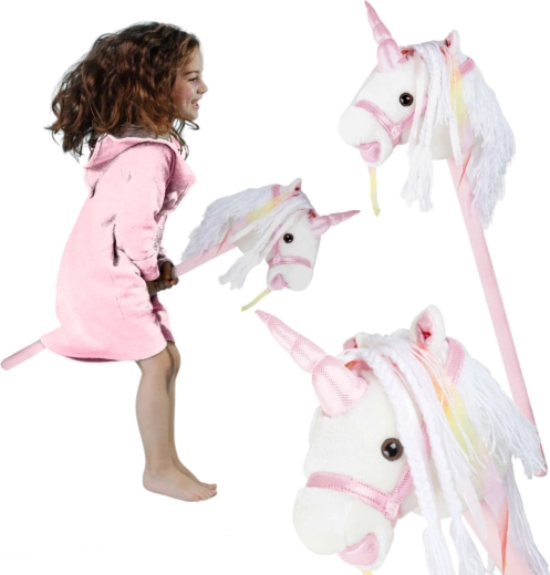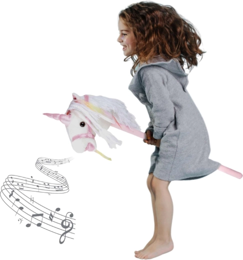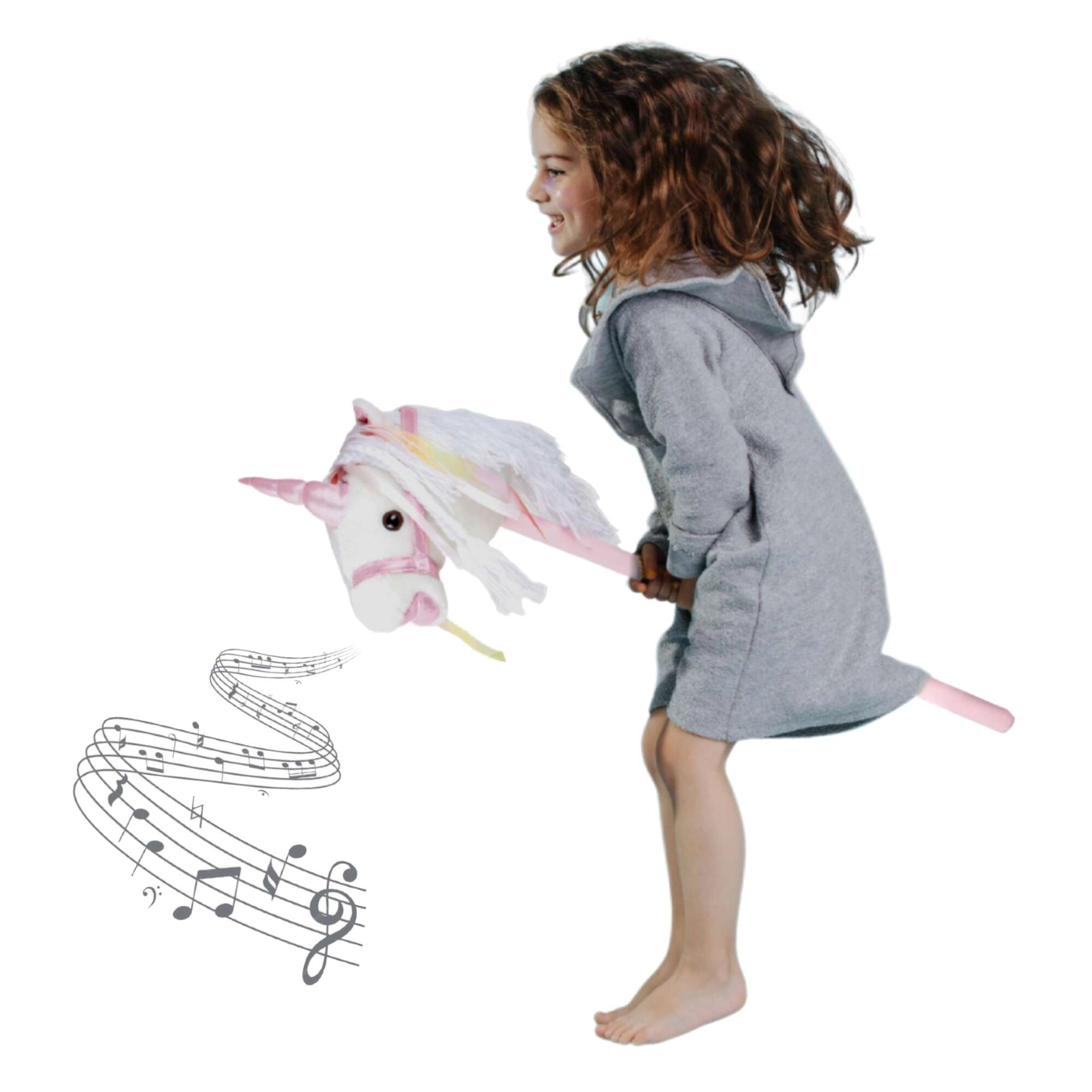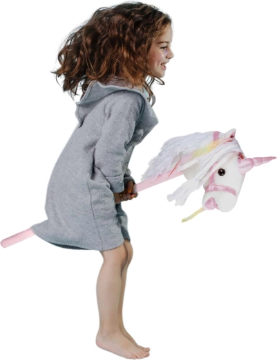 Este unicornio de palo fomenta el movimiento, la imaginación y el juego de roles. La felpa suave es agradable al tacto; la crin decorativa y los lazos aportan un toque mágico a cada paseo. Al presionar el botón en la oreja se activan sonidos realistas de trote y relincho, que hacen el juego de montar aún más envolvente para los niños.