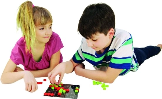 El juego incluye fichas de madera en forma de círculos Ø 1,5 cm y cruces de 1,5x1,5 cm. Todas las fichas llevan un imán en la base, lo que facilita su uso sobre la placa.