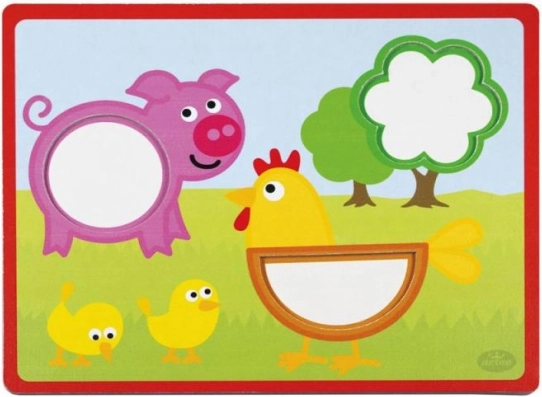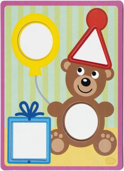 Los niños insertan las piezas de madera en los orificios correctos según las plantillas, adquiriendo de forma natural formas, colores y percepción espacial.