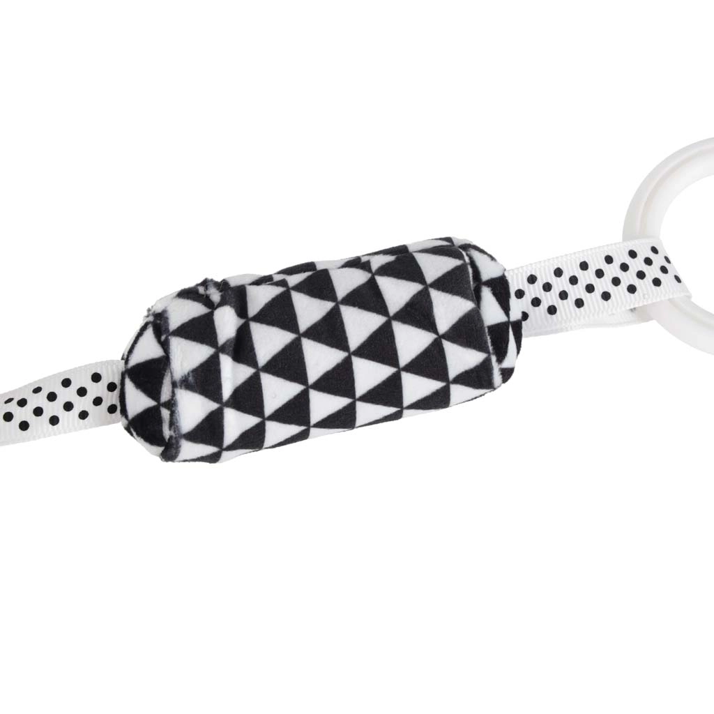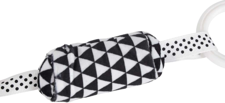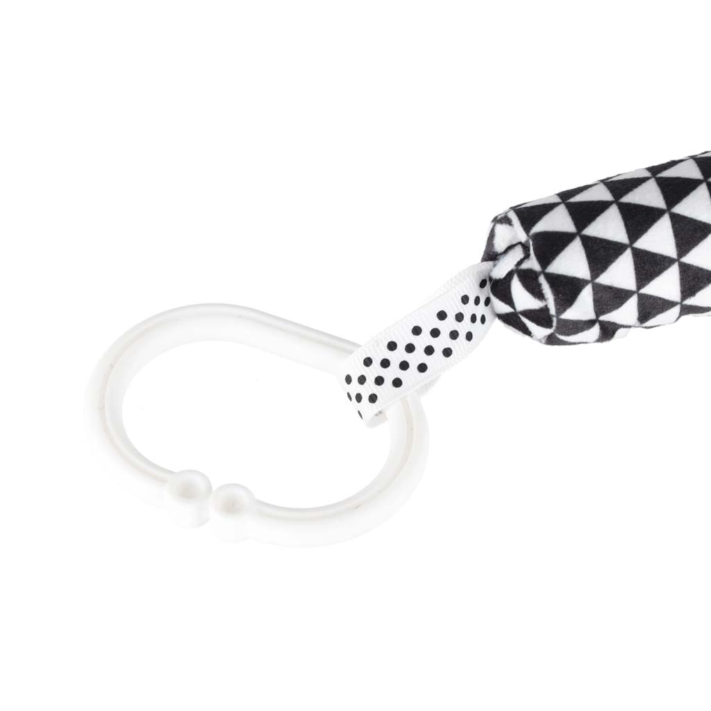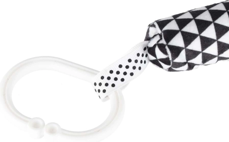 El práctico clip/anilla permite engancharlo rápidamente al asa del cochecito, a la silla de coche o al borde de la cuna. Así, el juguete siempre estará a mano.