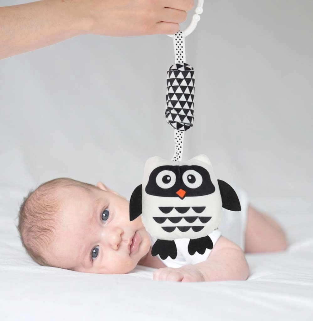 Este juguete colgante de contraste con forma de búho está diseñado pensando en las necesidades de los recién nacidos. El alto contraste de los colores blanco y negro atrae la mirada del bebé y favorece el desarrollo visual temprano. Los materiales suaves y agradables al tacto y su fabricación segura garantizan un descubrimiento cómodo y seguro.