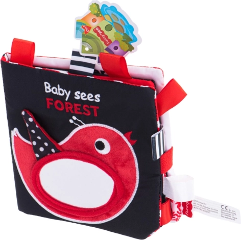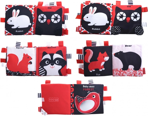 Prepara a tu bebé para un mágico viaje de descubrimiento del mundo de las formas y los patrones con este maravilloso libro. Está diseñado en colores de alto contraste, como negro, blanco y rojo, ideales para la estimulación visual de los más pequeños. El libro incluye cuatro páginas textiles con animalitos como pajarito, conejito, búho, zorro, oso, ardilla y mapache.