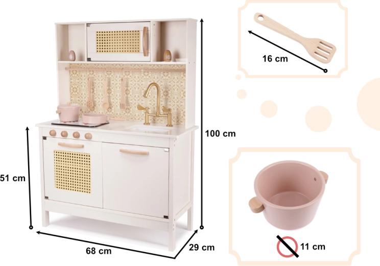 Los ingeniosos espacios de almacenamiento y los prácticos accesorios —olla con tapa, sartén, sal y pimienta, cucharón, cuchara ranurada y espátula ranurada— mantienen la “cocina” en orden y enseñan a los niños la organización del espacio. La mayoría de las piezas son de madera, la superficie está finamente lijada y acabada con pinturas no tóxicas para máxima seguridad.