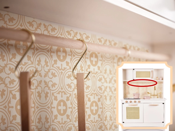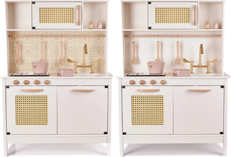 Fomenta la imaginación y la motricidad fina de tus peques con una cocinita que parece de verdad. Los mandos de madera giratorios, las puertas abatibles, la barra con ganchos y el panel extraíble de la placa con efectos de luz y sonido convierten cocinar en diversión y aprendizaje sin riesgos. El fondo de doble cara (liso color crema/papel pintado ornamental) permite cambiar fácilmente el aspecto de la cocinita según el estado de ánimo.