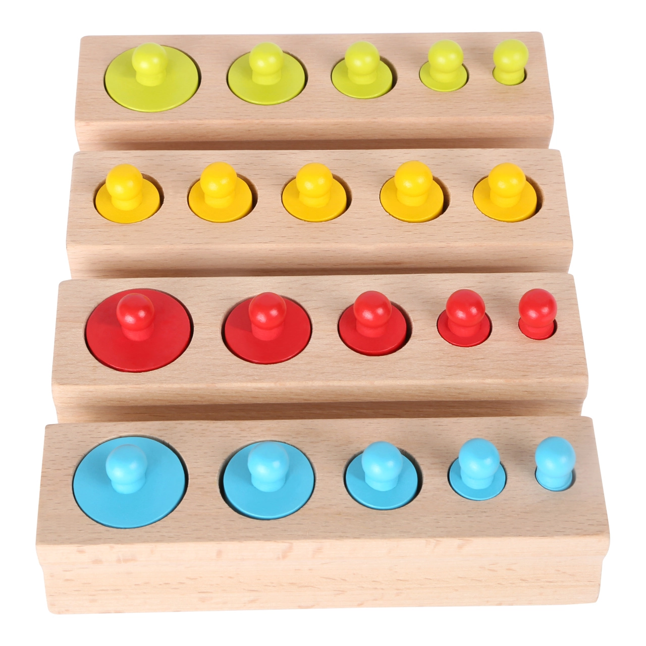 Los cilindros de colores de madera ayudan a los niños a comprender patrones y a tomar decisiones sobre la colocación correcta.