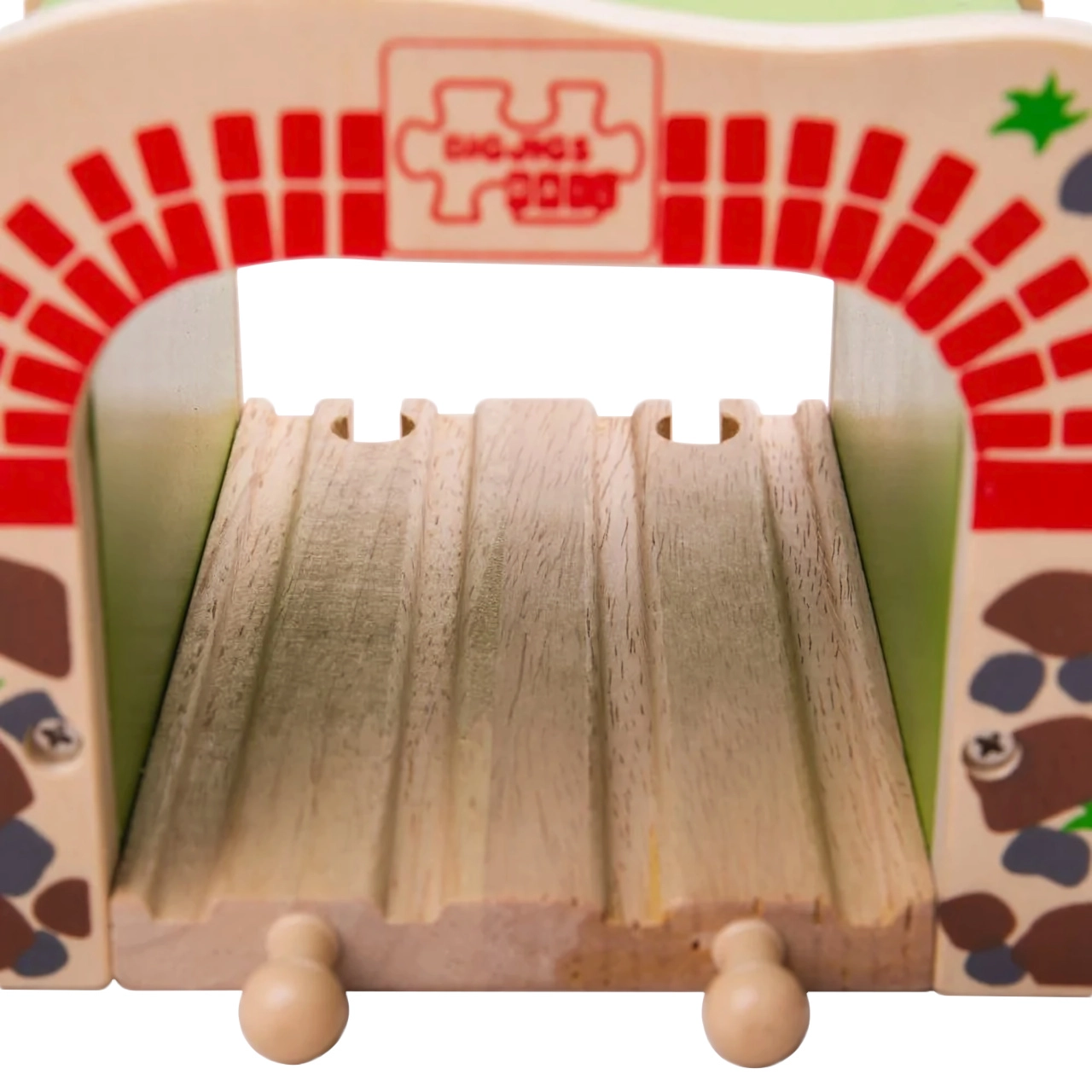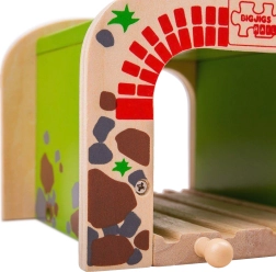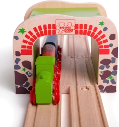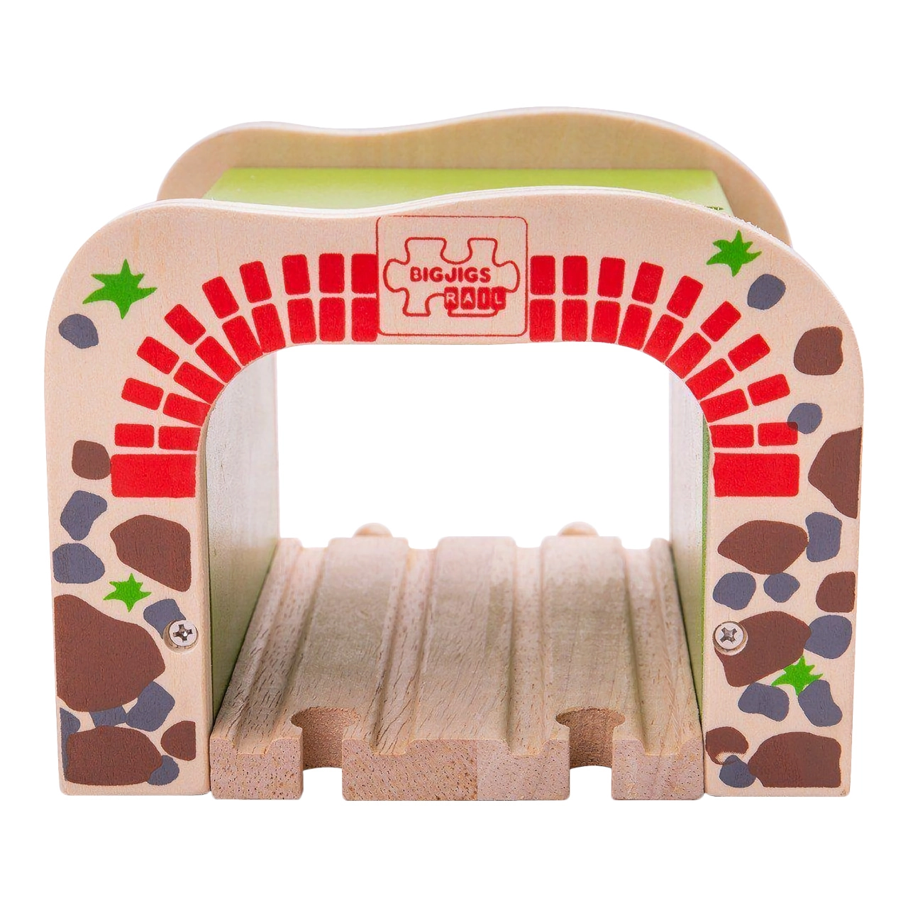 El túnel doble de madera BIGJIGS RAIL aporta más acción y un funcionamiento más fluido al mundo de los trenes de madera. Gracias al paso de doble vía, pueden pasar dos trenes a la vez, lo que fomenta el juego conjunto y el desarrollo de la coordinación. Su estructura sólida y el atractivo motivo de ladrillo y piedra aportan un aspecto realista a la vía.